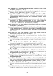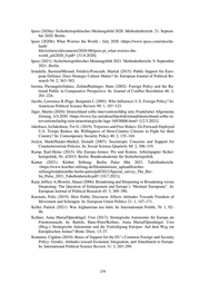 Ipsos (2020a): Sicherheitspolitisches Meinungsbild 2020. Methodenbericht. 21. Septem- ber 2020. Berlin. Ipsos (2020b): What Worries the World – July 2020 <https://www.ipsos.com/sites/de- fault/ files/ct/news/documents/2020-08/ipsos-pi_what-worries-the- world_juli2020_0.pdf> [31.8.2020]. Ipsos (2021): Sicherheitspolitisches Meinungsbild 2021: Methodenbericht. 9. September 2021. Berlin. Irondelle, Bastien/Mérand, Frédéric/Foucault, Martial (2015): Public Support for Euro- pean Defence: Does Strategic Culture Matter? In: European Journal of Political Re- search 54: 2, 363–383. Isernia, Pierangelo/Juhász, Zoltán/Rattinger, Hans (2002): Foreign Policy and the Ra- tional Public in Comparative Perspective. In: Journal of Conflict Resolution 46: 2, 201–224. Jacobs, Lawrence R./Page, Benjamin I. (2005): Who Influences U.S. Foreign Policy? In: American Political Science Review 99: 1, 107–123. Jäger, Martin (2020): Deutschland sollte interventionsfähig sein. Frankfurter Allgemeine Zeitung, 6.9.2020 <https://www.faz.net/aktuell/politik/inland/deutschland-sollte-in- terventionsfaehig-sein-neuestrategische-lage-16938806.html> [12.5.2021]. Jakobsen, Jo/Jakobsen, Tor G. (2019): Tripwires and Free-Riders: Do Forward-Deployed U.S. Troops Reduce the Willingness of Host-Country Citizens to Fight for their Country? In: Contemporary Security Policy 40: 2, 135–164. Joslyn, Mark/Haider-Markel, Donald (2007): Sociotropic Concerns and Support for Counterterrorism Policies. In: Social Science Quarterly 88: 2, 306–319. Kamp, Karl-Heinz (2015): Die Europa-Armee: Pro und Kontra. Arbeitspapier Sicher- heitspolitik, Nr. 4/2015. Berlin: Bundesakademie für Sicherheitspolitik. Kantar (2021): Körber Stiftung: Berlin Pulse Mai 2021. Tabellenbericht. <https://www.koerber-stiftung.de/fileadmin/user_upload/koerber- stiftung/redaktion/the-berlin-pulse/pdf/2021/Special_survey_The_Ber- lin_Pulse_2021_Tabellenbericht.pdf> [10.7.2021]. Karp, Jeffrey A./Bowler, Shaun (2006): Broadening and Deepening or Broadening versus Deepening: The Question of Enlargement and Europe’s “Hesitant Europeans”. In: European Journal of Political Research 45: 3, 369–390. Karstens, Felix (2019): How Public Discourse Affects Attitudes Towards Freedom of Movement and Schengen. In: European Union Politics 21: 1, 147–171. Keller, Patrick (2021): Was Afghanistan uns lehrt. In: Internationale Politik, 76: 1, 92– 96. Kellner, Anna Maria/Optenhögel, Uwe (2017): Strategische Autonomie für Europa als Friedensmacht. In: Bartels, Hans-Peter/Kellner, Anna Maria/Optenhögel, Uwe (Hrsg.): Strategische Autonomie und die Verteidigung Europas: Auf dem Weg zur Europäischen Armee? Bonn: Dietz, 13–37. Kentmen, Cigdem (2010): Bases of Support for the EU’s Common Foreign and Security Policy: Gender, Attitudes toward Economic Integration, and Attachment to Europe. In: International Political Science Review 31: 3, 285–299. 279