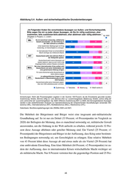 Abbildung 5.4: Außen- und sicherheitspolitische Grundorientierungen „Im Folgenden finden Sie verschiedene Aussagen zur Außen- und Sicherheitspolitik. Bitte sagen Sie mir zu jeder dieser Aussagen, ob Sie ihr völlig zustimmen, eher zustimmen, teils zustimmen/teils ablehnen, eher ablehnen oder völlig ablehnen.“ Vgl. 2020 (Angaben in Prozent, n = 2.037) MIL Es ist manchmal notwendig, militärische Gewalt anzuwenden, um die Ordnung in 33 32 32 2 +4 der Welt aufrecht zu erhalten. Unter bestimmten Bedingungen ist Krieg 25 29 43 3 +1 notwendig, um Gerechtigkeit zu erlangen. In internationalen Krisen ist wirtschaftliche Macht wichtiger als militärische Macht. 64 25 8 3 +2 INT Deutschland sollte eine aktivere Rolle in der Weltpolitik spielen. 42 32 21 5 -4 Deutschland wahrt seine Interessen am besten dadurch, dass es sich nicht in die 42 33 21 3 -2 Angelegenheiten anderer Staaten einmischt. Bei einer internationalen Krise sollten sich MUL Deutschland und seine Verbündeten auf 74 20 61 +1 eine gemeinsame Haltung einigen. Für seine Sicherheit sollte Deutschland vor 40 31 27 2 -1 allem alleine sorgen. In außenpolitischen Fragen sollte ATL Deutschland in Übereinstimmung mit den 42 38 16 4 +13 USA handeln. Deutschland sollte seine Interessen gegen- 67 24 6 3 -8 über den USA selbstbewusster vertreten. Zustimmung Teils/teils Ablehnung Weiß nicht/k.A. Anmerkungen: Nicht alle Prozentangaben ergeben in der Summe 100 Prozent, da die Einzelwerte gerundet wurden. Zustimmung: Anteile „Stimme völlig zu“ und „Stimme eher zu“ zusammengefasst; Ablehnung: Anteile „Lehne völlig ab“ und „Lehne eher ab“ zusammengefasst. Vgl. 2020: Differenz Zustimmung 2021 zu 2020. Die hervorgehobenen Aussagen werden in den weiterführenden Analysen zur Operationalisierung der entsprechenden Grundhaltungen verwendet: Mili- tarismus (MIL), Internationalismus (INT), Multilateralismus (MUL), Atlantizismus (ATL). Datenbasis: Bevölkerungsbefragungen des ZMSBw 2020 und 2021. Die Mehrheit der Bürgerinnen und Bürger weist eine insgesamt anti-militaristische Grundhaltung auf. So ist nur ein Drittel (33 Prozent; +4 Prozentpunkte im Vergleich zu 2020) der Befragten der Meinung, dass es manchmal notwendig sei, militärische Gewalt anzuwenden, um die Ordnung in der Welt aufrecht zu erhalten, während jeweils 32 Pro- zent diese Aussage ablehnen oder geteilter Meinung sind. Ein Viertel (25 Prozent; +1 Prozentpunkt) der Bürgerinnen und Bürger ist der Auffassung, dass Krieg unter bestimm- ten Bedingungen notwendig sei, um Gerechtigkeit zu erlangen. Eine relative Mehrheit von 43 Prozent lehnt diese Aussage ab und etwas mehr als ein Viertel (29 Prozent) hat eine ambivalente Einstellung. Eine klare Mehrheit (64 Prozent; +2 Prozentpunkte) ist zu- dem der Auffassung, dass in internationalen Krisen wirtschaftliche Macht wichtiger sei als militärische Macht. Nur 8 Prozent vertreten hier die gegenteilige Position und 25 Pro- 48