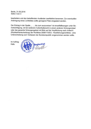 Berlin, 31.05.2016 Seite 2 von 3 Referat 415-PTU 90343 Nürnberg Referat M 5 im HAUSE Betreff: Grenzübertrittsbescheinigung hier: Bundeseinheitliches Muster Bezug, BMiI-Schreiben vom 25. November und 18. Dezember 2009 (M I 3 - 125 200 II) Aktenzeichen: M 2 - 20105/22#2 Berlin, 31. Mai 2016 Seite 2 von 3 Anlage: -1- Im November 2009 wurde im Rahmen der Abstimmung der Allgemeinen Verwal- tungsvorschrift zum Aufenthaltsgesetz zu Nr. 50.4 (Erfüllung der Ausreisepflicht) ein bundeseinheitliches Vordruckmuster der Grenzübertrittsbescheinigung mit dem Aus- wärtigen Amt und den Ländern erarbeitet. Mit Bezugsschreiben vom 18. Dezember 2009 wurde dieses bundeseinheitliche Vordruckmuster der Grenzübertrittsbescheini- gung zur künftigen Verwendung empfohlen. Das Auswärtige Amt berichtete, dass die Auslandsvertretungen durch das Anneh- men und Zurücksenden der Rücksendebescheinigung einer erheblichen zusätzlichen Arbeitsbelastung ausgesetzt sind, die in den Vertretungen viele Ressourcen bindet. Verstärkt wird die Problematik nach Mitteilung des Auswärtigen Amt dadurch, dass die aus den Ländern zu bearbeitenden Grenzübertrittsbescheinigungen sehr unein- heitlich sind. Um den Verwaltungsaufwand so gering wie möglich zu halten, sollte das Vordruckmuster einheitlich gestaltet werden und zur sicheren Identifizierung der Person ein Lichtbild enthalten. Es wird gebeten, künftig als Grenzüberrtrittsbescheinigung inhaltlich das als Anlage beigefügte Muster zu verwenden. Die Anbringung eines Lichtbildes sollte nur erfol- gen, wenn kein weiterer für die Ausreise erforderlicher Identitätsnachweis (Pass oder PEP) vorliegt. Bereits auf der ersten Seite der GÜB wird das Datum, bis zu dem die Ausreise zu erfolgen hat, eingetragen. Der Briefkopf der Ausstellenden Behörde soll- te alle erforderlichen Daten zur handelnden Behörde inkl. Erreichbarkeit des Sach-