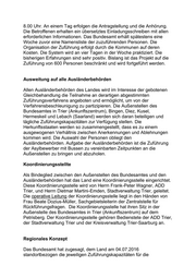 8.00 Uhr. An einem Tag erfolgen die Antragstellung und die Anhörung. Die Betroffenen erhalten ein übersetztes Einladungsschreiben mit allen erforderlichen Informationen. Das Bundesamt erhält spätestens eine Woche zuvor eine Namensliste der zuzuführenden Personen. Die Organisation der Zuführung erfolgt durch die Kommunen auf deren Kosten. Die System wird an vier Tagen in der Woche praktiziert. Die bisherigen Erfahrungen sind sehr positiv. Bislang ist das Projekt auf die Zuführung von 600 Personen beschränkt und wird fortgeführt werden. Ausweitung auf alle Ausländerbehörden Allen Ausländerbehörden des Landes wird im Interesse der gebotenen Gleichbehandlung die Teilnahme an derartigen abgestimmten Zuführungsverfahrens angeboten und ermöglicht, um von der Verfahrensbeschleunigung zu partizipieren. Die Außenstellen des Bundesamtes in Trier (Ankunftszentrum), Bingen, Diez, Kusel, Hermeskeil und Lebach (Saarland) werden sich daran beteiligen und tägliche Zuführungskapazitäten zur Verfügung stellen. Die Herkunftsstaaten werden so zusammengestellt, dass es zu einem ausgewogenen Verhältnis zwischen Anerkennungen und Ablehnungen kommen wird. Die Auswahl der Personen obliegt den Ausländerbehörden. Aufgabe der Ausländerbehörden ist die Zuführung der Asylbewerber mit Bussen zu vereinbarten Zeitpunkten an die Außenstellen zu bringen und abzuholen. Koordinierungsstellte Als Bindeglied zwischen den Außenstellen des Bundesamtes und den Ausländerbehörden hat das Land eine Koordinierungsstelle eingerichtet. Diese Koordinierungsstelle wird von Herrn Frank-Peter Wagner, ADD Trier, und Herrn Dietmar Martini-Emden, Stadtverwaltung Trier, geleitet. Die operative Leitung der Koordinierungsstelle liegt in den Händen von Frau Beate Dozius-Müller, Sachgebietsleiterin der Zentralstelle für Rückführungsfragen. Die Koordinierungsstelle hat ihren Sitz in der Außenstelle des Bundesamtes in Trier (Ankunftszentrum) auf dem Petrisberg. Der Koordinierungsstelle gehören Bedienstete der ADD Trier, der Stadtverwaltung Trier und der Kreisverwaltung Trier-Saarburg an. Regionales Konzept Das Bundesamt hat zugesagt, dem Land am 04.07.2016 standortbezogen die jeweiligen Zuführungskapazitäten für die