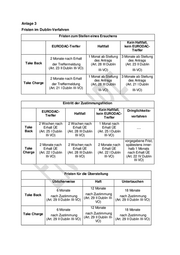 Anlage 3 Fristen im Dublin-Verfahren Fristen zum Stellen eines Ersuchens Kein Haftfall, EURODAC-Treffer Haftfall kein EURODAC- Treffer 1 Monat ab Stellung 3 Monate ab Stellung 2 Monate nach Erhalt des Antrags des Antrags Take Back der Treffermeldung (Art. 28 III Dublin (Art. 23 II Dublin (Art. 23 II Dublin III-VO) III-VO) III-VO) 1 Monat ab Stellung 3 Monate ab Stellung 2 Monate nach Erhalt des Antrags des Antrags Take Charge der Treffermeldung (Art. 28 III Dublin (Art. 21 I Dublin (Art. 21 I Dublin III-VO) III-VO) III-VO) Eintritt der Zustimmungsfiktion Kein Haftfall, Dringlichkeits- EURODAC- Haftfall kein EURODAC- Treffer verfahren Treffer 2 Wochen nach 2 Wochen nach 1 Monat nach Take Erhalt ÜE Erhalt ÜE Erhalt ÜE Back ⁻⁻⁻ (Art. 25 I Dublin (Art. 28 III Dublin (Art. 25 I Dublin III-VO) III-VO) III-VO) vorgegebene Frist, 2 Monate nach 2 Wochen nach 2 Monate nach spätestens inner- Take Erhalt ÜE Erhalt ÜE Erhalt ÜE halb 1 Monats Charge (Art. 22 I Dublin (Art. 28 III Dublin (Art. 22 I Dublin nach Erhalt ÜE III-VO) III-VO) III-VO) (Art. 22 IV Dublin III-VO) Fristen für die Überstellung Üblicherweise Haft Untertauchen 12 Monate 6 Monate 18 Monate Take Back nach Zustimmung nach Zustimmung nach Zustimmung (Art. 29 II Dublin III- (Art. 29 II Dublin III-VO) (Art. 29 II Dublin III-VO) VO) 12 Monate 6 Monate 18 Monate Take Charge nach Zustimmung nach Zustimmung nach Zustimmung (Art. 29 II Dublin III- (Art. 29 II Dublin III-VO) (Art. 29 II Dublin III-VO) VO)