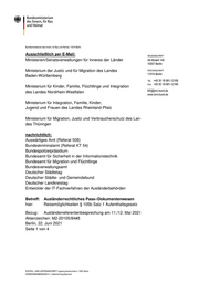 Bundesministerium des Innern, für Bau und Heimat, 11014 Berlin Ausschließlich per E-Mail: HAUSANSCHRIFT Ministerien/Senatsverwaltungen für Inneres der Länder Alt-Moabit 140 10557 Berlin Ministerium der Justiz und für Migration des Landes POSTANSCHRIFT 11014 Berlin Baden-Württemberg TEL +49 30 18 681-12168 FAX +49 30 18 681-12168 Ministerium für Kinder, Familie, Flüchtlinge und Integration M2@bmi.bund.de des Landes Nordrhein-Westfalen www.bmi.bund.de Ministerium für Integration, Familie, Kinder, Jugend und Frauen des Landes Rheinland-Pfalz Ministerium für Migration, Justiz und Verbraucherschutz des Lan- des Thüringen nachrichtlich: Auswärtiges Amt (Referat 508) Bundeskriminalamt (Referat KT 54) Bundespolizeipräsidium Bundesamt für Sicherheit in der Informationstechnik Bundesamt für Migration und Flüchtlinge Bundesverwaltungsamt Deutscher Städtetag Deutscher Städte- und Gemeindebund Deutscher Landkreistag Entwickler der IT-Fachverfahren der Ausländerbehörden Betreff: Ausländerrechtliches Pass-/Dokumentenwesen hier: Reisemöglichkeiten § 105b Satz 1 Aufenthaltsgesetz Bezug: Ausländerreferentenbesprechung am 11./12. Mai 2021 Aktenzeichen: M2-20105/84#8 Berlin, 22. Juni 2021 Seite 1 von 4 ZUSTELL- UND LIEFERANSCHRIFT Ingeborg-Drewitz-Allee 4, 10557 Berlin VERKEHRSANBINDUNG S + U-Bahnhof Hauptbahnhof
