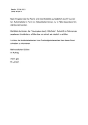 Berlin, 22.06.2021 Seite 4 von 4 Nach Vorgaben des EU-Rechts sind Aufenthaltstitel grundsätzlich als eAT zu ertei- len, Aufenthaltstitel in Form von Klebeetiketten können nur in Fällen besonderer Um- stände erteilt werden. BMI bittet die Länder, die Fristvorgaben des § 105b Satz 1 AufenthG im Rahmen der gegebenen Umstände zu erfüllen bzw. so zeitnah wie möglich zu erfüllen. Ich bitte, die Ausländerbehörden Ihres Zuständigkeitsbereiches über dieses Rund- schreiben zu informieren. Mit freundlichen Grüßen Im Auftrag elektr. gez. Dr. Jansen