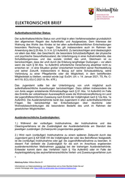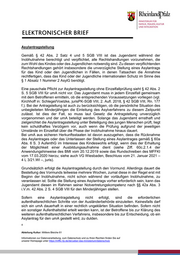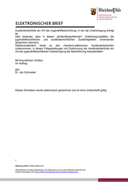Ausländerbehörde am Ort der Jugendhilfeeinrichtung, in der die Unterbringung erfolgt ist. Dies bedeutet, dass in diesen „länderübergreifenden“ Unterbringungsfällen die jugendhilferechtlichen und ausländerrechtlichen Zuständigkeiten voneinander abweichen (können). Selbstverständlich bleibt es den rheinland-pfälzischen Ausländerbehörden unbenommen, in diesen Fallgestaltungen mit Zustimmung der Ausländerbehörde am Ort der jugendhilferechtlichen Unterbringung die Aktenführung beizubehalten. Mit freundlichen Grüßen Im Auftrag gez. Dr. Jan Schneider Dieses Schreiben wurde elektronisch gezeichnet und ist ohne Unterschrift gültig. 7 Abteilung Kultur: Mittlere Bleiche 61 Informationen zur Datenverarbeitung, zum Datenschutz und zu Ihren Rechten finden Sie auf unserer Homepage unter https://mffki.rlp.de/de/ueber-das-ministerium/datenschutz
