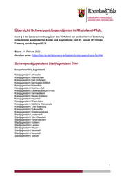 Übersicht Schwerpunktjugendämter in Rheinland-Pfalz nach § 3 der Landesverordnung über das Verfahren zur landesinternen Verteilung unbegleiteter ausländischer Kinder und Jugendlicher vom 25. Januar 2017 in der Fassung vom 6. August 2019 Stand: 21. Februar 2022 Abrufbar unter: https://lsjv.rlp.de/de/unsere-aufgaben/kinder-jugend-und-familie/ Schwerpunktjugendamt Stadtjugendamt Trier kooperierendes Jugendamt Kreisjugendamt Ahrweiler Kreisjugendamt Altenkirchen Kreisjugendamt Bad Dürkheim Kreisjugendamt Bernkastel-Wittlich Kreisjugendamt Birkenfeld Kreisjugendamt Cochem-Zell Kreisjugendamt Eifelkreis Bitburg-Prüm Kreisjugendamt Germersheim Kreisjugendamt Mayen-Koblenz Kreisjugendamt Neuwied Kreisjugendamt Rhein-Lahn Kreisjugendamt Südliche Weinstraße Kreisjugendamt Trier-Saarburg Kreisjugendamt Vulkaneifel Kreisjugendamt Westerwaldkreis Stadtjugendamt Andernach Stadtjugendamt Idar-Oberstein Stadtjugendamt Kaiserslautern Stadtjugendamt Koblenz Stadtjugendamt Landau Stadtjugendamt Mayen Stadtjugendamt Neustadt Stadtjugendamt Neuwied Stadtjugendamt Speyer 1