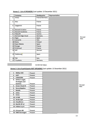 Annex 2 - List of SPEAKERS (Last update: 13 December 2021) | _ |Company |Headquarter | Representative |_4.| DassaultAvistion | France |_5.| DassaultSytems | France | 6.|FbsofttD2— | Austria Germany - Personal ale —_ —spain Bens | 9|leorarddo DD [Italy | !dNkia 202022 [Finland |_ 11 OpenNebla 2 [Spain | 2lorange | France France I EEE Lu 17| T-Systems Germany Art.4(3) 2nd subpar. Annex 3- List of participants NOT SPEAKING (Last update: 13 December 2021) 1. AbiliansAs [Present 2. LEET (Present | 3. LINAGORA [Present | 4. Arthur's Legal, Strategies and Systems |__ 5. GreenCloudAl |Presnt Da |__6. SecureAppbox |Present 7. Retlit 0 Present 8 Jin Present | | 9: Ins Present | 10.XFAB OD Present | __ 11. ArubaspA Present |__12.Cloudferro Present | __ 133. RelOG3Psrl [Present | |__14. IrideosS.p A Present 16. SWDDormagen |Present | 14