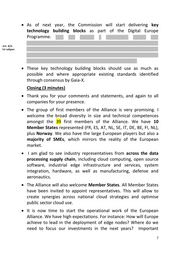 As of next year, the Commission will start delivering key technology building blocks as part of the Digital Europe Programme. Art. 4(3) 1st subpar. These key technology building blocks should use as much as possible and where appropriate existing standards identified through consensus by Gaia-X. Closing (3 minutes) Thank you for your comments and statements, and again to all companies for your presence. The group of first members of the Alliance is very promising. I welcome the broad diversity in size and technical competences amongst the 39 first members of the Alliance. We have 10 Member States represented (FR, ES, AT, NL, SE, IT, DE, BE, FI, NL), plus Norway. We also have the large European players but also a majority of SMEs, which mirrors the reality of the European market. I am glad to see industry representatives from across the data processing supply chain, including cloud computing, open source software, industrial edge infrastructure and services, system integration, hardware, as well as manufacturing, defense and aeronautics. The Alliance will also welcome Member States. All Member States have been invited to appoint representatives. This will allow to create synergies across national cloud strategies and optimise public sector cloud use. It is now time to start the operational work of the European Alliance. We have high expectations. For instance: How will Europe achieve to lead in the deployment of edge nodes? Where do we need to focus our investments in the next years? Important 7