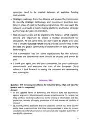 synergies need to be created between all available funding instruments. Strategic roadmaps from the Alliance will enable the Commission to identify strategic technology and investment priorities over time in view of next EU funding programmes. We also want the Alliance to provide a match-making platform, and foster strategic partnerships between its members. Not all organisations will be eligible to the Alliance. Strict eligibility criteria are important to create a trusted environment for discussion. At the same time, we don’t want to create any silos. This is why the Alliance Forum should provide a conference for the broader and global community of stakeholders in data processing technologies. The Commission has set some expectations for the Alliance. However the operational work should be shaped and driven by you. I thank you again, you and your companies, for your continuous commitment, and welcome the start of the European Cloud Alliance. I look forward to seeing the outcome and reconvening very soon again. Defensives / Q&A Question: Will the European Alliance for Industrial Data, Edge and Cloud be open to non-EU companies? Answer: In the updated Terms of Reference, the Alliance does not discriminate against any entity. All entities with relevant activities in the EU can join, but they will have to declare adherence to the criteria of information and data protection, security of supply, protection of IP and absence of conflicts of interest. [if pushed further] applicants that are subject to control by a third-country entity have to demonstrate that they have guarantees in place to prevent unsolicited transfer of personal or non-personal data by public authorities of non-EU/EEA countries. 8