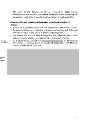 Art.4ß) 2nd subpar. Art.4ß8) e The work of the Alliance should be anchored in global market developments. For instance, the Alliance Forum will aim at broadening the perspective, making the links with all relevant actors, including globally. Question: What will be relationship between the Alliance and Gaia-X? Answer e Gaia-X has a different scope and goal compared to the Alliance. Gaia-X focuses on delivering a technical reference architecture and federated services as well as linking actors in data sharing ecosystems. e The Alliance will act at a more strategic and less operational level. It will deliver an industrial vision on investment and technology priorities. e As a neutral European platform, 0 the Alliance will also include a working group for structured cooperation with Member States on public sector cloud use.