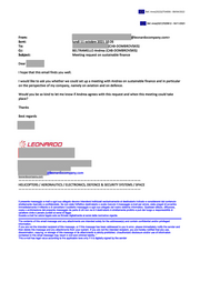 Ref. Ares(2022)2754006 - 08/04/2022 ļ Ref. Ares(2021 J7029812-16/11 /2021 From: @leonardocompany.com> Sent: lundi 11 octobre 2021 10:26 To: (CAB-DOMBROVSKIS) Cc: BELTRAMELLO Andrea (CAB-DOMBROVSKIS) Subject: Meeting request on sustainable finance Dear I hope that this email finds you well. I would like to ask you whether we could set up a meeting with Andrea on sustainable finance and in particular on the perspective of my company, namely on aviation and on defence. Would you be so kind to let me know if Andrea agrees with this request and when this meeting could take place? Thanks Best regards leonardocompany.com leonardocompany.com HELICOPTERS / AERONAUTICS / ELECTRONICS, DEFENCE & SECURITY SYSTEMS / SPACE Il presente messaggio e-mail e ogni suo allegato devono intendersi indirizzati esclusivamente al destinatario indicato e considerarsi dal contenuto strettamente riservato e confidenziale. Se non siete l'effettivo destinatario o avete ricevuto il messaggio e-mail per errore, siete pregati di avvertire immediatamente il mittente e di cancellare il suddetto messaggio e ogni suo allegato dal vostro sistema informatico. Qualsiasi utilizzo, diffusione, copia o archiviazione del presente messaggio da parte di chi non ne è il destinatario è strettamente proibito e può dar luogo a responsabilità di carattere civile e penale punibili ai sensi di legge. Questa e-mail ha valore legale solo se firmata digitalmente ai sensi della normativa vigente. The contents of this email message and any attachments are intended solely for the addressee(s) and contain confidential and/or privileged information. If you are not the intended recipient of this message, or if this message has been addressed to you in error, please immediately notify the sender and then delete this message and any attachments from your system. If you are not the intended recipient, you are hereby notified that any use, dissemination, copying, or storage of this message or its attachments is strictly prohibited. Unauthorized disclosure and/or use of information contained in this email message may result in civil and criminal liability. “ This e-mail has legal value according to the applicable laws only if it is digitally signed by the sender