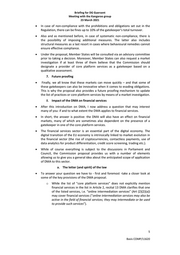 Briefing for DG Guersent Meeting with the Kangaroo group 23 March 2021 In case of non-compliance with the prohibitions and obligations set out in the Regulation, there can be fines up to 10% of the gatekeeper’s total turnover. Also and as mentioned before, in case of systematic non-compliance, there is the possibility of imposing additional measures. The latter also includes structural measures as a last resort in cases where behavioural remedies cannot ensure effective compliance. Under the proposal, Member States will be consulted via an advisory committee prior to taking a decision. Moreover, Member States can also request a market investigation if at least three of them believe that the Commission should designate a provider of core platform services as a gatekeeper based on a qualitative assessment. 7. Future proofing Finally, we all know that these markets can move quickly – and that some of these gatekeepers can also be innovative when it comes to evading obligations. This is why the proposal also provides a future proofing mechanism to update the list of practices or core platform services by means of a market investigation. 8. Impact of the DMA on financial services After this introduction on DMA, I now address a question that may interest many of you: if and to what extent the DMA applies to financial services. In short, the answer is positive: the DMA will also have an effect on financial markets, many of which are sometimes also dependent on the presence of a gatekeeper in one of the core platform services. The financial services sector is an essential part of the digital economy. The digital transition of the EU economy is intrinsically linked to market evolution in the financial sector (the rise of cryptocurrencies, contactless payments, use of data analytics for product differentiation, credit score screening, trading etc.). While of course everything is subject to the discussions in Parliament and Council, the Commission proposal provides us with a number of elements allowing us to give you a general idea about the anticipated scope of application of DMA to this sector. a. The letter (and spirit) of the law To answer your question we have to - first and foremost -take a closer look at some of the key provisions of the DMA proposal. o While the list of “core platform services” does not explicitly mention financial services in the list in Article 2, recital 13 DMA clarifies that one of the listed services, i.e. “online intermediation services” (Art (2)(2)(a)) may cover financial services (“online intermediation services may also be active in the field of financial services; they may intermediate or be used to provide such services”). 5 Basis COMP/11620