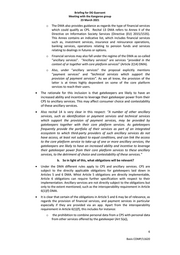 Briefing for DG Guersent Meeting with the Kangaroo group 23 March 2021 o The DMA also provides guidance as regards the type of financial services which could qualify as CPS. Recital 13 DMA refers to Annex II of the Directive on Information Society Services (Directive (EU) 2015/1535). This Annex contains an indicative list, which includes financial services such as, investment services, insurance and reinsurance operations, banking services, operations relating to pension funds and services relating to dealings in futures or options. o Financial services may also fall under the regime of the DMA as so-called “ancillary services”. “Ancillary services” are services “provided in the context of or together with core platform services” (Article 2(14) DMA). o Also, under “ancillary services” the proposal explicitly mentions “payment services” and “technical services which support the provision of payment services”. As we all know, the provision of the latter is at times highly dependent on some of the core platform services to reach their users. The rationale for this inclusion is that gatekeepers are likely to have an increased ability and incentive to leverage their gatekeeper power from their CPS to ancillary services. This may affect consumer choice and contestability of these ancillary services. Also recital 14 is very clear in this respect: “A number of other ancillary services, such as identification or payment services and technical services which support the provision of payment services, may be provided by gatekeepers together with their core platform services. As gatekeepers frequently provide the portfolio of their services as part of an integrated ecosystem to which third-party providers of such ancillary services do not have access, at least not subject to equal conditions, and can link the access to the core platform service to take-up of one or more ancillary services, the gatekeepers are likely to have an increased ability and incentive to leverage their gatekeeper power from their core platform services to these ancillary services, to the detriment of choice and contestability of these services.” b. So in light of this, what obligations will be relevant? Under the DMA different rules apply to CPS and ancillary services. CPS are subject to the directly applicable obligations for gatekeepers laid down in Articles 5 and 6 DMA. Whist Article 5 obligations are directly implementable, Article 6 obligations can require further specification with respect to their implementation. Ancillary services are not directly subject to the obligations but only to the extent mentioned, such as the interoperability requirement in Article 6(1)(f) DMA. It is clear that certain of the obligations in Article 5 and 6 may be of relevance, as regards the provision of financial services, and payment services in particular especially if they are provided via an app. Apart from the interoperability requirement in Article 6(1)(f), this includes for instance: o the prohibition to combine personal data from a CPS with personal data from other services offered by the gatekeeper (Art 5(a)), 6 Basis COMP/11620