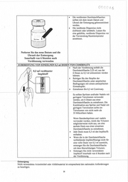 i) QÜ4 5 Gleichen Sie den Druck in der Durchstechflasche aus, bevor Sie die Nadel aus der Durchstechflasche entfernen, indem Sie 1,8 ml Luft in die leere Spritze des Verdünnungsmittels ziehen. Ziehen Sie den Kolben bis 1,8 ml hoch, um Luft von der Durchstechflasche zu entfernen Drehen Sie die verdünnte Dispersion lO-mal vorsichtig um. Nicht schütteln. Der verdünnte Impfstoff sollte als grauweiße Dispersion ohne sichtbare Partikel vorliegen. Entsorgen Sie den verdünnten Impfstoff, wenn Partikel oder Verfärbungen vorhanden sind. Vorsichtig X I0 ~ 34