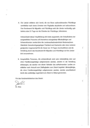 8. Die Länder erklären sich bereit, die von ihnen aufzunehmenden Flüchtlinge unmittelbar nach deren Einreise vom Flughafen abzuholen und aufzunehmen. Das Bundesamt für Migration und Flüchtlinge wird die Länder rechtzeitig, spä testens aber 21 Tage vor der Einreise der Flüchtlinge, informieren. Unbeschddet dieser Verpflichtung wird stets angestrebt, die Erstaufnahme der ausgewählten Personen mit Ausnahme uhbegleitoter Minderjähriger und Schwerstkranker zentral über die Landesaufnahmebehörde Niedersachsen Standorte Grenzdurchgangslager Friedland und Bramsche oder einer anderen geeigneten Liegenschaft für die Dauer von 14 Tagen durchzuführen und die Verteilung durch das Bundesamt für Migration und Flüchtlinge auf die Länder dort yorzunehm'en. 9, Ausgewählte Personen, die schwerstkrank sind oder minderjährig sind und ohne Familienangehörige aufgenommen werden, werden ln die Verteilung einbezogen; sie werden von einem Vertreter des aufnehmenden Landes un mittelbar nach Ankunft.vom Zielflughafen zum Zielort begleitet. Minderjährige, die ohne Familienangehörige aufgehommen werden, werden anschließend durch das zuständige Jugendamt am Zielort in Obhut genommen. Für das Bundesministerium des. Innern