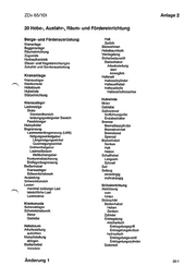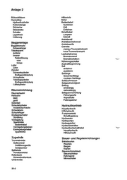 ZDv 65/101 Anlage 2 20 Hebe-, Ausfahr-, Räum- und Fördereinrichtung Berge- und Förderausrüstung Krananlage Baggeranlage Räumeinrichtung Zugwinde Hydraulikantrieb . Steuer- und Regeleinrichtungen Zubehör und Sonderausrüstung Krananlage Kranausleger Krankonsole Hebebaum Hubwinde Stützeinrichtung Kranausteger Lastanzeige Skale Standardbereich leistungsgestaigarter Bareich Pendeizeiger Hubzylinder Begrenzung: Lastrmomentbegrenzung (LMB} Neigungswinkelgeber Längsneigungswinkel Quemeigungswinkei Drehwinkeigeber Lastmeßböolzen Meßbofzengeber Konturenabsicherung Endlagenbegrenzung Bedienhebel Kranausleger Schwenktriebwerk Ausladung Schwenkbereich Lasten . maximal zulässige Last tatsächliche Last Lastreserve Krankonsolte Schwenktager Schwenktriebwerk Motor Geiriebe Habebaum Arbeitsstellung aufrichten Marschstellung ablegen Bedienhebel Vorwäns Änderung 1 Hat Zurück Stützrahmen Hebebaumkorb Veriegelung Sicherheitsventil Bedienhebel Arbeitsstellung starr beweglich Halteseil Halteseilzylinder Hafteseilhebel Hafteseilrotle Hatteseitroflenachse Hubwinde Motor Getriebe Seiltrommel Sellführungsülle Endabschalter Bremse | Bremslösezylinger Bremstrommel Bremsband Sperrad Bedienhebel Senken Halt Heben Schalthebel Langsam . Schnell Seil Seilzug einsträngig mehrsträngig Stützeinrichtung Abstützung yom hinten Stützschild Bedienhebel Heben Senken Zylinder Entriegelung mechanisch -Entriegelungsariff Eniriegeiungskoßben hydraulisch Entriegelungsventi Entriegelungszylinder 'Seitenteil 20-1