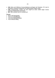 -2- USA: Mehr als 40 Millionen Corona-Infektionen seit Beginn der Pandemie. 75 % der Er- wachsenen mindestens erstgeimpft. Die Infektionszahlen steigen wieder. CAN: Premierminister Trudeau will nach Angriff bei einem Auftritt wegen Corona- Impfungen Wahlkampfstil nicht ändern. NZL: hebt Lockdown auch für Auckland auf. Termine 09.09. TSK Risikogebiete 10.09. AG Impfstoffabgabe 10.09. StA Impfstoffproduktion 14.09. KriSta der BReg