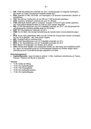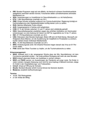 -2- ISR: Booster-Programm zeigt sich als effektiv, da hierdurch schwere Krankheitsverläufe weitgehend verhindert werden können; Forschende stellen schnellwirksames antivirales Medikament vor. SDA: Vereinbarungen zu Investitionen im Gesundheitssektor u.a. mit AstraZeneca. ETH: 1.664 Neuinfektionen innerhalb von 24 h. ZWE: Einige Schulen schließen aufgrund von Corona-Ausbrüchen; Regierung kündigt an Impfverweigerung unter Staatsbediensteten künftig keinen Lohn zu zahlen. RUS: Mehrere Mitarbeiter Putins infiziert. AUS: Ausgangssperre in Sydney wird aufgehoben. CHN: 91 % der Schüler zwischen 12 und 17 Jahren sind vollständig geimpft. HKG: Gesundheitsexperten empfehlen wegen des erhöhten Auftretens von Herzmuskel- entzündungen nur eine Impfung mit Vakzin von B/P für Jugendliche zw.12 bis 17 Jahren. IND: 27.176 Neuinfektionen innerhalb von 24 h. USA: Diskussion über Booster-Impfungen; Biden trifft sich mit Walt Disney, Microsoft und Walgreens Boot Alliance, um die Ausdehnung der Impfpflicht im Privatsektor zu erörtern; kaufen weitere Dosen Antikörper-Medikamente BOL: 14.340 Neuinfektionen innerhalb von 24 h. BRA: Ansteckungsrate sinkt.100 infizierte Personen tragen danach das Virus an 81 Per- sonen weiter. PAN: berät über Pläne Touristen zu impfen, um die Tourismusbranche zu retten. Krisenmanagement: WHO: Weltweit sind in der vergangenen Woche etwa vier Mio. Neuinfektionen mit dem Coronavirus gemeldet worden – der erste größere Rückgang seit mehr als zwei Monaten. WHO kritisiert abermals Horten von Impfdosen in reichen Ländern. WHO und PAHO warnen vor Auswirkungen der Pandemie auf junge Leute. Da Kinder in vielen Ländern mangels Zulassung noch nicht für eine Impfung in Betracht kommen, steige ihr Anteil in den Hospitalisierungs- und Todeszahlen. Unicef: dringt auf Öffnung der Schulen. Studie: Biontech-Booster erhöht Corona-Schutz bei Senioren deutlich. Moderna: empfiehlt Auffrischimpfungen Termine 16.09. TSK Risikogebiete 21.09. KriSta der BReg