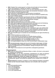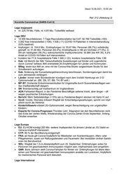 Stand 20.09.2021, 16:00 Uhr Ref. 312 (Abteilung 2) Kurzinfo Coronavirus (SARS-CoV-2) Lage insgesamt rd. 228,50 Mio. Fälle, rd. 4,69 Mio. Todesfälle weltweit Lage DEU 3.736 Neuinfektionen; 7-Tage-Reproduktionsfaktor bei 0,93; 92.971 Todesfälle (+13) 3.644 freie Intensivbetten (+13), 1.544 (-7) COVID-19 Patienten in Intensivbehandlung (54% beatmet) Impfungen: rd. 105,7 Mio.; Erstimpfungen: rd. 55,87 Mio. Personen (67,2%); vollständig geimpft: rd. 52,50 Mio. Personen (63,1%); Erstimpfquote in HB am höchsten (77,9%), in SN am niedrigsten (57,0%); wahrscheinliche Impfdurchbrüche: 40.110 (bis KW 36). Inzidenz bei 71,0 (ꜛ); hospitalisierte Fälle 1.369 (-199 zu Freitag); Inzidenz hospitalisierte Fälle 1,65 (ꜜ). BM Spahn: positive Bilanz der zu Ende gegangenen Impf-Aktionswoche, rund 500.000 Erstimpfungen. BM Spahn: Antikörpertest plus eine Corona-Impfung reichen künftig aus, um als geschützt zu gelten. BM Spahn: rechnet Anfang 2022 mit Corona-Impfstoff für Unter-12-Jährige. KBV: Chef Gassen: hofft auf zusätzliche Impfmotivation bei Terminierung des Endes der Corona-Maßnahmen, Ungeimpfte werden sich wahrscheinlich bis zum Frühjahr infizieren. Stat. Bundesamt: Zahl der im Verkehr verunglückten Kinder lag im Jahr 2020 fast 20 Pro- zent niedriger als im Jahr 2019. SH: 3G-Regel führt zu mehr Freiheiten: Maskenpflicht fällt teilweise weg usw., konstante Inzidenz und niedrige Hospitalisierungsrate. Medien: Zuverlässigkeit der Hospitalisierungsquote in der Diskussion Studie: Uni Melbourne: Die Problematik von Long-Covid bei Kindern und Jugendlichen lässt sich anhand der aktuellen Studienlage kaum beurteilen. Lage Europa AUT: Wintersportbetrieb soll mit 3G-Nachweispflicht und FFP2-Maskenpflicht zugelassen werden, Kapazitätsbeschränkungen und Abstandsregeln nicht geplant, Après-Ski soll bei steigenden Infektionszahlen eventuell nur für Geimpfte möglich sein. BEL: Ab Oktober soll Maskenpflicht teilweise ausgesetzt werden (insb. in Geschäften und in der Gastronomie), Zugang zu Clubs für Gäste mit „Covid-Ticket“ (3G-Nachweis) mög- lich. FRA: Mehr als 86% der Bevölkerung über 12 Jahren haben Erstimpfung erhalten. GBR: Vollständig Geimpfte müssen ab 4. Oktober bei Einreise nach England keinen ne- gativen Test mehr vorlegen; am zweiten Tag nach Ankunft nur noch Antigentest (statt PCR-Test) erforderlich; PM Johnson befürwortet Priorisierung von Auffrischungsimpfungen für Risikogruppen vor Impfstoffspenden an andere Staaten. ITA: Deutlicher Anstieg (20-40%) von Terminvereinbarungen für Erstimpfungen im Ver- gleich zur Vorwoche nach Ankündigung der „Green Pass“-Pflicht (Nachweis von 3G- Status) für Arbeitnehmer bei Präsensarbeit ab 15. Oktober. SVN: Pflicht für Beschäftigte des öffentlichen Dienstes, ab 1. Oktober bei Präsensarbeit genesen oder geimpft zu sein. VAT: Zutritt zum Kirchenstaat ab 1. Oktober nur noch mit 3G-Status, Ausnahmen für Gläubige bei Messen und liturgischen Feiern. Lage International IND: Gesundheitsminister kündigt Wiederaufnahme von Impfstoffexporten ab Oktober an, bis Ende 2021 sollen eine Mrd. Impfdosen exportiert und v.a. an COVAX geliefert werden. ...
