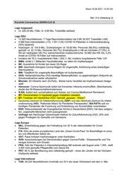 Stand 21.09.2021, 14:30 Uhr Ref. 312 (Abteilung 2) Kurzinfo Coronavirus (SARS-CoV-2) Lage insgesamt rd. 229,05 Mio. Fälle, rd. 4,70 Mio. Todesfälle weltweit Lage DEU 4,664 Neuinfektionen; 7-Tage-Reproduktionsfaktor bei 0,88 (ꜜ); 93.052 Todesfälle (+81) 3.341 freie Intensivbetten (-303), 1.504 (-37) COVID-19 Patienten in Intensivbehandlung (55% beatmet) Impfungen: rd. 105,8 Mio.; Erstimpfungen: rd. 55,93 Mio. Personen (67,3%); vollständig geimpft: rd. 52,60 Mio. Personen (63,3%); Erstimpfquote in HB am höchsten (78,0%), in SN am niedrigsten (57,1%); wahrscheinliche Impfdurchbrüche: 40.110 (bis KW 36). Inzidenz bei 68,5 (ꜜ); hospitalisierte Fälle 1.352 (-17); Inzidenz hospitalisierte Fälle 1,63(ꜜ). Chef BK hat Vorwürfe von "Horror-Prognosen" in der Corona-Pandemie in der BILD zu- rückgewiesen. Paul Ehrlich- und Ludwig Darmstaedter-Preis 2022 für Gründer und Mitarbeiter von Bion- tech. Die Ehrung würdigt die Technologie zur Entwicklung des Corona-Impfstoffs als Pa- radigmenwechsel in der Medizin. BReg: vorerst gegen ein festes Datum für ein Ende aller Corona-Auflagen, wegen der niedrigen Impfquote lehnt auch der Marburger Bund einen "Freedom Day" ab, Erwin Rüddel kritisiert den Vorstoß ebenfalls. Der Pflegebeauftragte der Bundesregierung, Andreas Westerfellhaus, hat sich gegen eine Corona-Impfpflicht für Pflegekräfte ausgesprochen. BT: Gesundheitsausschuss rechnet mit Ende der Corona-Beschränkungen im März 2022. HH: Hamburg lockert 2G-Modell - Maskenpflicht entfällt. SN: Kabinett beschließt neue Corona-Regeln - 2G-System greift. RP: Maskenstreit in Tankstelle – Entsetzen bei verschiedenen Politikern nach tödlichem Angriff Lage Europa CZE beginnt mit Auffrischungsimpfungen. Empfohlen ist die dritte Impfung ausdrücklich für Senioren ab 60 Jahren, Angehörige von Risikogruppen sowie Gesundheits- und Pfle- gepersonal. FRA plant, Gesundheitspass über den 15.11. hinaus zu verlängern. GBR: 36.100 tägliche COVID-19-Fälle. Die Gesamtzahl letzten 7 Tagen im Vergleich zur Vorwoche 12 % gesunken. GRC verhängt ab dieser Woche voraussichtlich Geldbußen und Strafen für Verstöße am Arbeitsplatz und in Restaurants. IRL plant eine einmalige Prämie als Anerkennung für die Bemühungen der Mitarbeiter von Covid-19. KOS: Lt. Gesundheitsminister nur 48 neue positive Fälle in den letzten 24h. Zahl der Neu- infektionen und Todesfälle rückläufig, niedrigste seit Anfang August. NLD: seit fast 10 Wochen fiel 7-Tage-Durchschnitt erstmalig unter 2.000 Fälle. Viele Be- schäftigte im Gesundheitswesen haben aufgrund der Coronavirus-Krise mit psychischen und physischen Gesundheitsproblemen zu kämpfen. ROU erwartet Mitte Oktober durchschnittlich bis zu 17.000 Fälle/ Tag. Lage International BRA: 7.884 Neuinfektionen/24 h und 203 Todesfälle BLR: Die vierte Welle hat Weißrussland erreicht. COD: 32 Parlamentarier sind an Covid-19 gestorben, seit das Virus im März 2020 zum ersten Mal in dem Land aufgetreten ist. ...