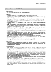 Stand 08.10.2021, 13:00 Kurzinfo Coronavirus (SARS-CoV-2) Lage insgesamt rd. 236,7 Mio. Fälle, rd. 4,83 Mio. Todesfälle weltweit Lage DEU 10.429 Neuinfektionen; 7-Tage-R-Wert 1,01 (ꜛ); 94.113 Todesfälle (+86) 3.030 freie Intensivbetten (-14), 1.351 (-23) COVID-19-Patienten in Intensivbehandlung (55% beatmet) Impfungen: rd. 108,8 Mio.; Erstimpfungen: rd. 56,91 Mio. Personen (68,4%); vollständig geimpft: 54,14 Mio. Personen (65,1%); Erstimpfquote in HB am höchsten (79,7%), in SN am niedrigsten (58,1%); Inzidenz bei 63,8 (ꜛ); hospitalisierte Fälle 1.391 (+52); Inzidenz hospitalisierte Fälle 1,67 (ꜛ). BM Spahn: hält wegen höherer Impfquote bestimmte Corona-Maßnahmen für verzichtbar. KMK: will vollständigen und kontinuierlichen Präsenzunterricht sicherstellen, sprach sich zudem für eine zurückhaltende Quarantäne-Politik auch nach Ende der Maskenpflicht durch die Gesundheitsämter aus, empfiehlt nachdrücklich die Impfung für Kinder und Er- wachsene ab 12 Jahren. RKI: Corona-Ausbrüche an Schulen häufen sich früher als 2020 (für die vergangenen vier Wochen 201 Kita- und 481 Schulausbrüche). Lage Europa FIN: Impfungen junger männlicher Patienten mit Moderna werden aufgrund Berichte selte- ner Nebenwirkungen ausgesetzt. ITA: Corona-Regeln werden gelockert. Kinos, Theater und Konzertsäle können wieder alle ihre Plätze besetzen, Sportstadien draußen 75 % der Plätze. Lage International UZB: beginnt mit Produktion von Sputnik V-Impfstoff im Rahmen einer Kooperation mit RUS. HUN: bietet ROU Unterstützung bei Behandlung von Coronapatienten an. PRK: Corona-Hilfeleistungen werden im Hafen von Nampho in Quarantäne gehalten. AUS: lockert 100-tägigen Lockdown in Sydney und Umgebung. IND: will Grenzen für Touristen wieder öffnen. UKR: ordnet Impflicht für Lehrer und Staatsangestellte an. USA: Präsident Biden fordert Unternehmen auf, eine Impfpflicht für ihre Mitarbeiter einzu- führen. GBR: Nordirland streicht Ende Oktober als letzter Landesteil fast alle Corona- Maßnahmen. JPN: vereinbart mit Pfizer eine Lieferung von 120 Millionen Impfdosen ab Januar 2022. Krisenmanagement VN/WHO: VNGS Guterres fordert 8 Mrd. USD für eine Impfung von 40% der Weltbevölke- rung bis Ende des Jahres, die WHO möchte bis Mitte 2022 70% der Weltbevölkerung ge- impft haben. VN: VNGS Guterres: Horten von Corona-Vakzinen der reichen Länder unmoralisch und dumm. WHO: legt Definition von "Long Covid" vor. EGMR: hat eine Beschwerde gegen Test- und Nachweispflichten in FRA als unzulässig zurückgewiesen. ...
