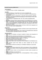 Stand 13.10.2021, 16:30 Kurzinfo Coronavirus (SARS-CoV-2) Lage insgesamt rd. 238,7 Mio. Fälle, rd. 4,87 Mio. Todesfälle weltweit Lage DEU 11.903 Neuinfektionen; 7-Tage-R-Wert 0,93 (ꜜ); 94.389 Todesfälle (+92) 2.913 freie Intensivbetten (- 164), 1.400 (+ 18) COVID-19-Patienten in Intensivbehandlung (55% beatmet) Impfungen: rd. 109,3 Mio.; Erstimpfungen: rd. 57,07 Mio. Personen (68,6%); vollständig geimpft: 54,40 Mio. Personen (65,4%); Erstimpfquote in HB am höchsten (80,0%), in SN am niedrigsten (58,3%); Inzidenz bei 65,4 (ꜜ); hospitalisierte Fälle 1.417 (+163); Inzidenz hospitalisierte Fälle 1,90 (ꜛ). RKI: hat die Verantwortung für offenbar zu niedrige, offiziell gemeldete Corona-Impfquoten in Deutschland zurückgewiesen. (kann nur die Impfdaten veröffentlichen, die ihm entspre- chend übermittelt worden sind) Lage Europa LVA: hat den Notstand für die Dauer von drei Monaten erklärt (z. B. tritt ein Verbot öffentli- cher Veranstaltungen in Kraft), da mehr als 1.000 COVID-Infektionen (genau: 1.752) an einem Tag verzeichnet wurden. ROU: berichtet von 16.743 neuen Fälle an einem Tag; das ist der höchste, bisher gemes- sene Wert. EU: beabsichtigt einen Vertragsschluss mit Merck über oral zu verabreichender Covid- Medikation soweit Zulassungsanträge vorliegen. Lage International SRB: Balkan Insights deckt auf, dass in SRB 2020 tatsächlich 10.000 Personen an Covid verstarben, die Regierung aber nur von 3.300 Toten berichtete. RUS: registriert 973 neue Todesfälle, der höchste Wert seit Pandemiebeginn. Zudem wird Sputnik V als nasales Medikament an Freiwilligen getestet. IND: empfiehlt den Notfallgebrauch von Biontech für die Altersgruppe der zwei bis 18- Jährigen. CHN: verzeichnete eine Verabreichung von 1,4 Mio. Impfdosen an einem Tag; die insge- samte Abgabe beläuft sich nunmehr auf 2,2 Milliarden Impfdosen. USA: hat 403,6 Mio. Impfdosen verabreicht; Boeing Co hat – entsprechend Joe Bidens‘ order for federal contractors – Mitarbeitende mit Wohnsitz in den USA dazu verpflichtet, bis zum 8. Dezember ein Impfzertifikat vorzulegen. Grenzöffnungen für vollständig geimpfte Kanadier ist ab Anfang November geplant. KOR: spendet 1,1 Mio. Impfdosen an VNM und 470.000 an THA. Krisenmanagement Moderna: beabsichtigt den Bau neuer Fabriken in RWA, SEN, ZAF; Absicht ist, die eigene Produktion zu erhöhen, statt die Impfstoffformel zu teilen. ...