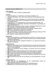 Stand 22.10.2021, 15:30 Kurzinfo Coronavirus (SARS-CoV-2) Lage insgesamt rd. 242,48 Mio. Fälle, rd. 4,93 Mio. Todesfälle weltweit Lage DEU 19.572 Neuinfektionen; 7-Tage-R-Wert: 1,16(ꜛ); 94.991 Todesfälle (+116). 2.866 freie Intensivbetten, 1.541 (+59) COVID-19-Patienten in Intensivbehandlung (55% beatmet). Impfungen: rd. 110,6 Mio.; Erstimpfungen: rd. 57,43 Mio. Personen (69,1%); vollständig geimpft: 54,98 Mio. Personen (66,1%); Erstimpfquote in HB am höchsten (80,6%), in SN am niedrigsten (58,6%). Inzidenz bei 95,11 (ꜛ); hospitalisierte Fälle: 2.229; Inzidenz hospitalisierte Fälle: 2,68. Länder-Beschluss für bundesweiten einheitlichen Rechtsrahmen zur Absicherung von Corona-Schutzmaßnahmen. BMG: BM Spahn plane keinen eigenen Vorstoß zu bundesweiter Regelung nach mögli- chem Auslaufen der epidemischen Lage; Ball liege im Parlament. Städtebund: Müssen Ende der epidemischen Lage nationaler Tragweite riskieren. RKI warnt vor beschleunigtem Anstieg der Corona-Fallzahlen. AFD: Fraktionsvorsitzender Chrupalla mit Corona infiziert. BW: Corona-Ausbruch in Freiburger Schule nach Zirkusaufführungen. Bislang 44 Fälle registriert, bis zu 1.500 Personen könnten betroffen sein. BY: Inzidenzen in einigen Landkreisen bei über 400. Lage Europa LVA: 1.406 Neuinfektionen pro 100.000 Einwohner innerhalb von 14 Tagen. Das ist der höchste Wert weltweit. Einmonatiger Lockdown beschlossen, alle nicht lebensnotwendigen Geschäfte sind geschlossen. EST: führt ab dem 25.10.2021 weitgehend 2G-Regel ein (u.a. Gastronomie, Sportveran- staltungen, Unterhaltung). Lage International RUS: Neue Coronavariante AY.4.2 wurde entdeckt, von der vermutet wird, dass sie anste- ckender ist als die Delta-Variante. Lockdown in Moskau zwischen dem 28.10.2021 und dem 07.11.2021 beschlossen. UKR: 22.415 Neuinfizierte und 546 Todesfälle in 24 Stunden. Dies sind die bisherigen Höchststände. SDA: hat alle Bürger aufgerufen Impftermine für eine dritte Impfung zu vereinbaren. MAR: hat als erstes Land der Maghreb-Region einen Coronaimpfpass eingeführt. HKG: Wegen Coronaverdachts wurde ein Kreuzfahrtschiff im Hafen festgehalten. NZL: Impfziel wurde auf 90% der erwachsenen Bevölkerung festgelegt. Dann könne auf Lockdowns verzichtet werden. GBR: überschreitet erstmals seit Juni die Schwelle von 50.000 Neuinfizierten in 24 Stun- den. Krisenmanagement WTO: USA rufen alle Mitgliedsstaaten auf, den urheberrechtlichen Schutz von Coronaimpfstoffen aufzuheben (TRIPS-Waiver). WHO: Notfallzulassungsprüfung für Sputnik V wird wiederaufgenommen. Biontech-Vakzin: Hohe Wirksamkeit bei Kindern von 90,7% laut Pfizer. ...
