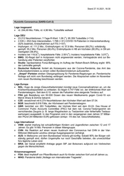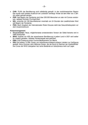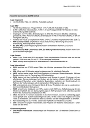 Stand 26.10.2021, 15:30 Kurzinfo Coronavirus (SARS-CoV-2) Lage insgesamt rd. 244,06 Mio. Fälle, rd. 4,96 Mio. Todesfälle weltweit Lage DEU 10.473 Neuinfektionen; 7-Tage-R-Wert: 1,17 (ꜜ); 95.245 Todesfälle (+128). 2.787 (- 255) freie Intensivbetten, 1.707 (+ 21 seit Freitag) COVID-19-Patienten in Inten- sivbehandlung (52% beatmet). Impfungen: rd. 111,0 Mio.; Erstimpfungen: rd. 57,5 Mio. Personen (69,2%); vollständig geimpft: 55,1 Mio. Personen (66,3%); Erstimpfquote in HB am höchsten (80,8%), in SN am niedrigsten (58,8%). Inzidenz bei 113,0(ꜛ); hospitalisierte Fälle: 2.454 (ꜛ); Inzidenz hospitalisierte Fälle: 2,95 (ꜛ). RWI–Leibniz-Institut: empfiehlt ein neues Instrument zur Bewertung der Corona- Entwicklung „Risikoadjustierte Inzidenz“ BL (HH, RP): Länder-Regierungschefs fordern einheitlichen Rahmen zur Corona- Bekämpfung. Virchowbund, MdB Lauterbach, DIVI, Dt. Stiftung Patientenschutz: fordern mehr Tem- po bei Booster-Impfungen. Lage Europa SVN: lt. nat. Studie sind 80% der wegen Covid hospitalisierten Fälle kein oder nur ein Mal geimpft. SVN hat in der EU mit 37,7% die niedrigste Impfquote. GBR: kündigt eine Impfpflicht für Mitarbeitende in Gesundheitsberufen an. Lage International RUS: berichtet von 37.930 neuen Fällen, der höchste, gemessene Wert seit Pandemiebe- ginn. IRN: öffnet nach 20 Monaten seine Landesgrenzen für vollständig Geimpfte. HKG: verfolgt weiter seine Null-Covid-Strategie mit strengen Quarantäneregeln. Mehrere Banken drohen nun, ihr Personal aus HKG abzuziehen. CHN: beginnt mit den Impfstoffen Sinopharm und Sinovac in versch. Provinzen mit ver- pflichtenden Corona-Impfungen bei Kindern ab drei Jahren. Zudem stellt CHN mehrere zehntausend Menschen unter häusliche Quarantäne, nachdem ein Covid-Ausbruch im Rahmen der Vorbereitungen auf die olympischen Winterspiele vorlag. IND: unterzeichnet einen Vertrag mit Merck & Co zur Produktion der oral zu verabreichen- den Covid-Medikation Molnupiravir. KOR: erreicht eine Impfquote von 70%; zudem erteilt KOR eine Notfallzulassung für den Moderna-Impfstoff, der von Samsung BioLogics in KOR produziert wird. Überdies spendet KOR 1 Mio. AstraZeneca Impfdosen an IRN. USA: Ab dem 8.11. können Ausländer in die USA einreisen, soweit sie vollständig gegen Covid geimpft sind. Zudem beabsichtigen die USA, 70 Mio. USD in die Abgabe von Covid- Tests zu investieren, um Kosten für diese zu senken, und die Verfügbarkeiten zu erhöhen. AU: beabsichtigt, bis zu 110 Mio. Dosen des Impfstoffs von Moderna zu kaufen. ZAF: versucht mit jungen Forschenden, das Präparat von Moderna nachzubauen – unter- stützt von der WHO. Krisenmanagement ZAF/Aspen Pharmacare: beabsichtigen die Produktion auf 1,3 Milliarden Dosen/Jahr zu erhöhen.
