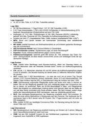 Stand: 11.11.2021, 17:00 Uhr Kurzinfo Coronavirus (SARS-CoV-2) Lage insgesamt rd. 251,41 Mio. Fälle; rd. 5,07 Mio. Todesfälle weltweit. Lage DEU 50.196 Neuinfektionen; 7-Tage-R-Wert: 1,07; 97.198 Todesfälle (+235). 2.417 freie Intensivbetten, 2.793 (+52) COVID-19-Patienten in Intensivbehandlung (51% beatmet), Neuaufnahmen (Erstaufnahme auf eine ITS) +248. Impfungen: rd. 114,1 Mio.; Erstimpfungen: rd. 58,1 Mio. Personen (69,9%); vollständig geimpft: 56,0 Mio. Personen (67,3%); Geimpfte mit Auffrischungsimpfung 3,3 Mio. Inzidenz bei 249,1(ꜛ); hospitalisierte Fälle: 3.896; Inzidenz hospitalisierte Fälle: 4,65(ꜛ). MPK: Bund und Länder beraten am kommenden Donnerstag über eskalierende Coronalage. MP Söder zweifelt Karneval und Weihnachtsmärkte an und kritisiert geplantes Bundesge- setz als unzureichend. AfD-Vorsitzende Weidel nach Corona-Infektion in Quarantäne. FDP-Vorsitzender Lindner: "Epidemische Lage" ist reiner Rechtsbegriff. Experten: Kurze, intensive Maßnahmen gegen Corona planen. Infektionsschutzgesetz: Dobrindt greift BM Scholz an: "Sie verlassen das Team Vor- sicht". Göring-Eckardt und Bas weisen Unions-Kritik zurück und verteidigen Ende der epi- demischen Notlage. Lage Europa FRA: meldet hohe Nachfrage nach Booster-Impfung. Allein am Dienstag haben ca. 150.000 Menschen über die Webseite Doctolib einen Termin zur Auffrischungsimpfung vereinbart. ITA: will ab 1.12. Menschen zwischen 40 und 60 Jahren die Auffrischungsimpfung gegen Covid-19 anbieten. Die Booster-Impfung sei bereits etwa 2,5 Millionen Menschen angebo- ten worden. AUT: meldet fast 11.400 Neuinfektionen – so viele wie noch nie an einem Tag. Derzeit werden 2.237 Corona-Patienten klinisch behandelt, davon 413 auf Intensivstationen. Die Sieben-Tage-Inzidenz liegt bei 655. In Oberösterreich stieg die Inzidenz auf über 1.000. GBR: Zehntausende ungeimpfte Pflegekräfte dürfen seit heute nicht mehr in Heimen ar- beiten. Die von der Regierung gesetzte Frist, sich vollständig gegen das Coronavirus imp- fen zu lassen, ist verstrichen. Mehr als 50.000 Beschäftigte in Alten- und Pflegeheimen haben das Angebot zur vollständigen Impfung bisher nicht genutzt. Mehr als die Hälfte da- von soll aber bisher zumindest eine Dosis erhalten haben. Bis April müssen zudem Ange- stellte des Gesundheitsdiensts NHS nachweisen, dass sie vollständig geimpft sind. NLD: Das wichtigste Beratergremium der Regierung empfiehlt einen Teil-Lockdown. Es wäre die erste solche Maßnahme in Westeuropa seit dem Sommer. Die Impfquote bei Er- wachsenen liegt in NLD derzeit nahe 85 Prozent. Die 7-Tage-Inzidenz wird mit mehr als 400 angegeben. POL: meldet 18.550 neu bestätigte Coronavirus-Fälle. Am Dienstag betrug die Zahl der neuen Fälle noch 13.644. Lage International ISR: Beratergremium der Regierung empfiehlt Impfung von Kindern ab 5 Jahren. Billigung durch Gesundheitsministerium steht noch aus. VNM: hat den IND Impfstoff Covaxin für den Notfalleinsatz zugelassen. Damit sind nun insgesamt neun Impfstoffe in VNM zugelassen. ...