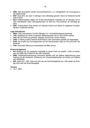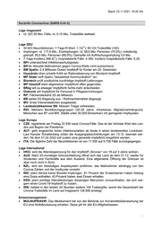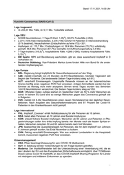 Stand: 17.11.2021, 14:00 Uhr Kurzinfo Coronavirus (SARS-CoV-2) Lage insgesamt rd. 254,37 Mio. Fälle; rd. 5,11 Mio. Todesfälle weltweit. Lage DEU 52.826 Neuinfektionen; 7-Tage-R-Wert: 1,05(ꜜ); 98.274 Todesfälle (+294). 2.374 (-104) freie Intensivbetten, 3.376 (+96) COVID-19-Patienten in Intensivbehandlung (51% beatmet), Neuaufnahmen (Erstaufnahme auf eine ITS) +301. Impfungen: rd. 115,7 Mio.; Erstimpfungen: rd. 58,4 Mio. Personen (70,2%); vollständig geimpft: 56,5 Mio. Personen (67,7%); Geimpfte mit Auffrischungsimpfung 4,4 Mio. 7-Tage-Inzidenz 319,5(ꜛ); hospitalisierte Fälle: 4.286 (+390); Inzidenz hospitalisierte Fälle: 5,15 (ꜛ). BM Spahn: MPK soll Bevölkerung wachrütteln, gibt an, dass ausreichend Impfstoff in D vorhanden sei. Deutscher Städtetag: Vize-Präsident Markus Lewe fordert Hilfe vom Bund für die anste- henden Impfkampagnen. Lage Europa BEL: Regierung bringt Impfpflicht für Gesundheitspersonal auf den Weg. CZE: meldet innerhalb von 24 Stunden 22.479 Neuinfektionen, höchster Tageswert seit Beginn der Pandemie. Die landesweite Sieben-Tage-Inzidenz stieg auf 813. AUT: verschärft Einreiseregeln. Ungeimpfte Reisende müssen an der österreichischen Grenze künftig einen negativen PCR-Test vorweisen. Antigen-Schnelltests werden bei der Einreise ab Montag nicht mehr akzeptiert. Binnen eines Tages wurden laut Behörden 14.416 Neuinfektionen verzeichnet. Die Sieben-Tage-Inzidenz stieg auf 953. BGR: Offiziellen Daten zufolge starben im September mehr als 50 % mehr Menschen als sonst. In keinem EU-Land sind so wenige Menschen gegen das Coronavirus geimpft wie in Bulgarien. SVK: meldet mit 8.342 Neuinfektionen einen neuen Höchststand bei den täglichen Neuin- fektionen. Nach Angaben des Gesundheitsministeriums sind 81 Prozent der Covid-19- Patienten in den Krankenhäusern nicht geimpft. Lage International PHL: Impfstoff „Covavax“ erhält Notfallzulassung für alle Personen ab 18 Jahren. BRA: bietet allen Personen ab 18 Jahren eine Booster-Impfung an. KOR: erlaubt frühere Booster-Impfungen. Menschen ab 60 Jahren und Patienten in Pfle- geeinrichtungen sollen ihre dritte Impfung bereits vier Monate nach der letzten Spritze er- halten. Menschen zwischen 50 und 60 Jahren bereits nach fünf Monaten. JPN: beabsichtigt die Quarantäneregeln für Personen, die mit dem Impfstoff von Johnson & Johnson geimpft wurden, bis Ende November zu lockern. CHN: Peking verschärft Einreiseregeln. Wer aus anderen Landesteilen in die Hauptstadt kommt, muss einen negativen PCR-Test vorweisen. Krisenmanagement USA: Pfizer beantragt Zulassung für sein COVID-19 Medikament. AUT: In Salzburg werden Vorbereitungen für ein Triage-System getroffen. Moderna: Der Impfstoffhersteller teilt die Unterzeichnung einer Vereinbarung mit, die es den Ländern der EU und des Europäischen Wirtschaftsraums ermöglicht, über 70 Millionen Dosen seines Covid-19-Impfstoffs an das COVAX-Impfstoff-Sharing-Programm für Länder mit niedrigem und mittlerem Einkommen zu spenden. ...