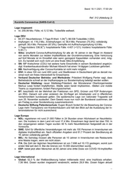 -2- täglich. Nur 4,7 % der Bevölkerung in einkommensschwachen Staaten haben mind. eine Dosis erhalten. RUS: meldet 1.251 Todesfälle im Zusammenhang mit dem Coronavirus in den letzten 24 Stunden. BRA: meldet 11.977 Neuinfektionen in den letzten 24 Stunden und 373 neue Todesfälle. MEX: meldet 332 weitere Todesfälle, womit die Gesamtzahl der Todesopfer im Land seit Beginn der Pandemie auf 291.573 steigt. WHO: teilt mit, dass die Todesfälle durch Coronaviren in Europa in der letzten Woche um 5 % gestiegen sind. Europa ist damit die einzige Region weltweit, in der die COVID-19- Sterblichkeit gestiegen ist. Krisenmanagement COVAX: hat insgesamt 509.290.918 Impfstoffdosen an 144 Staaten und Territorien ausge- liefert, weitere 11,6 Mio. Dosen sind aktuell unterwegs. NOVAVAX: Der US-Pharmakonzern hat für sein Covid-19-Vakzin eine Marktzulassung in der EU beantragt. Die EMA teilte mit, sie habe mit der Prüfung begonnen und werde in ei- nigen Wochen eine Entscheidung bekanntgeben. Emergex Vaccines: hat die behördlichen Genehmigungen für den Beginn der klinischen Phase I-Studie für den Impfstoffkandidaten Covid-19 erhalten. AstraZeneca: teilt mit, dass sein COVID-19-Antikörpermedikament das Risiko einer symp- tomatischen Erkrankung in einer langfristigen Nachbeobachtung um 83 % senkt. Daneben soll das Medikament auch das Risiko einer Verschlechterung der Symptome senken, wenn es innerhalb von drei Tagen nach den ersten Symptomen verabreicht wird. Forschung: Evolutionsbiologe Michael Worobey: Coronavirus kommt wahrscheinlich vom Tiermarkt in Wuhan. Termine 18.11. MPK
