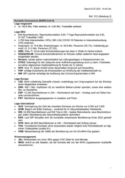 Stand 06.07.2021, 17:15 Uhr Ref. 312 (Abteilung 2) Kurzinfo Coronavirus (SARS-CoV-2) Lage insgesamt rd. 181,1 Mio. Fälle, rd. 3,98 Mio. Todesfälle weltweit. Lage DEU 440 Neuinfektionen, Reproduktionsfaktor 1,05; 7-Tage-Reproduktionsfaktor bei 0,93, 91.062Todesfälle (+31). 4.135 freie Intensivbetten (18%), 526 (-20) COVID-19 Patienten in Intensivbehandlung (67% beatmet). Impfungen: rd. 77,3 Mio. Erstimpfungen: rd. 47 Mio. Personen (56,5%). Vollständig ge- impft: rd. 32,36 Mio. Personen (38,9%). STIKO: Prof. Mertens wehrt sich gegen Einmischung von MP Söder und SPD Vors. Esken. „Gremium ist im Gesetz bewusst als unabhängige Kommission angelegt.“ Ges. f. Immunologie: Herdenimmunität ohne Impfung von Kindern nicht erreichbar. IAB: 28% der Betriebe mit Betriebsarzt bieten Impfungen an. ALM: Anteil der VOC Delta in den Laborproben bei 47% und dominierende Variante in DEU. Civey-Umfrage: 65,8% für ein Bußgeld für Impfschwänzer. BY: setzt in Grundschulen im neuen Schuljahr verstärkt auf PCR Pooltestungen. Lage Europa ESP: 14-Tage-Inzidenz steigt auf 204 im Vergleich zu 152 in der Vorwoche. GBR: PM Johnson kündigt an, alle Maßnahmen lockern bzw. aufheben zu lassen, da es an der Zeit sei, mit dem Virus leben zu lernen. LUX: PM Bettel ins Krankenhaus eingewiesen infolge einer Corona-Infektion Ende Juni. NOR: Verzögerung geplanter Lockerungen wegen Delta-Variante. Lage International Afrika: stark ansteigende Fallzahlen auf dem gesamten Kontinent – durchschnittlich über 36.000 Neuinfektionen in 24h; stockende Impfkampagne; Kritik an „2-Klassen-Politik der Impfstoffe“ da der hauptsächlich verimpfte AZ/SII-Impfstoff Covishield bspw. in der EU gar nicht zugelassen sei. CIV: „mobile Kliniken“ impfen in der Hauptstadt nun auf Märkten und anderen belebten Or- ten. MAR: Sinopharm plant Impfstoffproduktion in MAR. BGD: Strikter Lockdown wird wegen Delta-Variante verlängert. EGY: in erster Jahreshälfte 2021 lag die Anzahl der Todesfälle um 14,9% höher als im sel- ben Zeitraum 2020. ISR-KOR: Einigung auf Tausch von Impfstoffdosen - KOR bekommt nun 700.000 auslau- fende Dosen BT/P und wird im Sept/Okt die gleiche Zahl an ISR zurückgeben. IDN: 29.745 Neuinfektionen in 24h – Rekordwert. JPN: Abgabe mehrerer Mio. Dosen AZ an benachbarte Länder geplant, darunter 1,3 Mio. Dosen an TWN. VNM: 1.102 Neuinfektionen in 24h – Rekordwert. MEX: Erste Probecharge Sputnik V produziert. Krisenmanagement BioNTech/Pfizer: ISR berichtet von einer Wirksamkeit von nur rd. 64% gegen die Delta- Variante; der Schutz gegen schwere Verläufe bleibe jedoch hoch. Behandlung: Studie der Kansas University an Tieren zeigt vielversprechende Ergebnisse bei der Behandlung einer Corona-Infektion mit antiviralen Medikamenten. US Studie: mRNA aus Corona-Impfstoff nicht in Muttermilch nachweisbar. ...