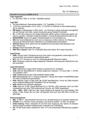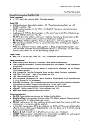 Stand 09.07.2021, 13:30 Uhr Ref. 312 (Abteilung 2) Kurzinfo Coronavirus (SARS-CoV-2) Lage insgesamt rd. 185,5 Mio. Fälle, mehr als 4 Mio. Todesfälle weltweit. Lage DEU 949 Neuinfektionen, Reproduktionsfaktor 1,02; 7-Tage-Reproduktionsfaktor bei 1,09; 91.190 Todesfälle (+49). 3.728 freie Intensivbetten (16 %), 470 (–14) COVID-19 Patienten in Intensivbehandlung (64 % beatmet). Impfungen: rd. 79,7 Mio. Erstimpfungen: rd. 47,8 Mio. Personen (57,6 %). Vollständig ge- impft: rd. 33,9 Mio. Personen (40,8 %). RP: MP´in Dreyer für weitere Lockerungen trotz Delta-Ausbreitung, dies schulde man Bür- gern, wenn keine Gefahr bestehe, dass Gesundheitswesen kollabiere. BY: MP Söder für Maskenpflicht u. Tests zum Schulstart u. mehr Impfungen bei Jugendl. KBV-Chef Gassen fordert von Bund u. Ländern konkreten Plan für Umgang mit möglicher 4. Corona-Welle. Ärzte ohne Grenzen: Vorstand Stöbe appelliert an BReg, Impfpatente freizugeben. Leer- kauf der mRNA-Impfstoffe durch reiche Staaten in Europa u. Nordamerika sei dafür verant- wortlich, dass in Afrika nur 2 % der Bevölkerung geimpft seien. Lage Europa BEL: Zum 1. Mal seit Sept. unter 100 COVID-19-Patienten auf Intensivstationen. Lage International BGD: Impfprogramm wird nach 2-monatiger Pause wieder aufgenommen. CHN: Lockdown verhängt für Stadt im Grenzgebiet zum mit schwerer Corona-Welle kämp- fenden MMR. IDN-THA: Auffrischungsimpfungen erwägt für medizinische Mitarbeiter, die mit Sinovac (CHN) geimpft wurden. JPN: Notstand für Tokio für Olympische Spiele verhängt; keine Zuschauer zugelassen. JPN-TWN: TWN erhält 1,1 Mio. AZ Impfdosen aus JPN. LBY: Grenzschließungen zu TUN. RUS: Langsame Stabilisierung der Lage in Moskau lt. Bürgermeister (6.040 Neuinfektionen in 24h in Moskau, 24.818 landesweit). RUS-PRK: RUS bietet PRK zum wiederholten Mal Impfungen an nach Berichten, dass strik- ter Lockdown zu starken Versorgungsproblemen u. Hunger geführt habe. TUN: Gesundheitssystem kollabiert (Intensivabteilungen voll, Ärzte überlastet). USA-URY: USA schicken 500.000 Pfizer Impfdosen nach URY. VNM: Neue Bewegungsbeschränkungen in Hanoi. Krisenmanagement EU-CHE: Gegenseitige Anerkennung der digitalen Impfzertifikate. BioNTech/Pfizer: In kommenden Wochen soll bei FDA, EMA u. weiteren Zulassungsbehör- den Zulassung für 3. Impfdosis beantragt werden. COVAX: Lieferung von 520 Mio. Impfdosen an Afrika von Sept.- Dez. (bisher erst 25 Mio. Impfdosen an 44 afrikanische Länder geliefert). Lt. Fachblatt Nature zeigen 95 % der vollständig mit BioNTech/Pfizer oder AZ Geimpften effiziente Immunreaktion gegen Delta-Variante, nach einer Dosis nur 10 % (ähnlich niedrig bei genesenen Ungeimpften). Soberna 2: CUB Impfstoff soll 91,2 % Wirksamkeit haben bei 3 Impfdosen. UNICEF: Abschluss eines 1. Lieferabkommens mit Hersteller von J&J für AU; Lieferung von 220 Mio. Impfdosen bis Ende 2022, 35 Mio. bis Ende 2021. ...