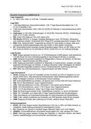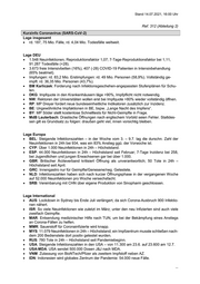 Stand 14.07.2021, 16:00 Uhr Ref. 312 (Abteilung 2) Kurzinfo Coronavirus (SARS-CoV-2) Lage insgesamt rd. 187, 75 Mio. Fälle, rd. 4,04 Mio. Todesfälle weltweit. Lage DEU 1.548 Neuinfektionen, Reproduktionsfaktor 1,07; 7-Tage-Reproduktionsfaktor bei 1,11, 91.287 Todesfälle (+28). 3.673 freie Intensivbetten (16%), 407 (-28) COVID-19 Patienten in Intensivbehandlung (65% beatmet). Impfungen: rd. 83,2 Mio. Erstimpfungen: rd. 49 Mio. Personen (58,9%). Vollständig ge- impft: rd. 36,35 Mio. Personen (43,7%). BM Karliczek: Forderung nach Infektionsgeschehen-angepassten Stufenplänen für Schu- len. DKG: Impfquote in den Krankenhäusern läge >90%, Impfpflicht nicht notwendig. NW: Rektoren der Universitäten wollen erst bei Impfquote >80% wieder vollständig öffnen. RP: MP Dreyer fordert neue bundeseinheitliche Indikatoren zusätzlich zur Inzidenz. BE: Ungewöhnliche Impfaktionen in BE, bspw. „Lange Nacht des Impfens“. BY: MP Söder stellt kostenlose Schnelltests für Nicht-Geimpfte in Frage. MdB Lauterbach: Drastische Öffnungen nach englischem Vorbild seien Fehler. Stattdes- sen gilt es Grundsatz zu folgen: draußen geht viel, innen vorsichtig bleiben. Lage Europa BEL: Steigende Infektionszahlen – in der Woche vom 3. – 9.7. lag die durschn. Zahl der Neuinfektionen in 24h bei 934, was ein 83% Anstieg ggü. der Vorwoche ist. CYP: Über 1.000 Neuinfektionen in 24h – Höchststand. ESP: 44.000 Neuinfektionen in 24h – Höchststand seit Februar; 7-Tage Inzidenz bei 258, bei Jugendlichen und jungen Erwachsenen gar bei über 1.000. GBR: Britischer Ärzteverband kritisiert Öffnung als unverantwortlich; 50 Tote in 24h – Höchststand seit April. GRC: Innengastro nur für Geimpfte/Genesene/neg. Getestete. NLD: Infektionszahlen haben sich nach kurzer Öffnungsphase in der vergangenen Woche auf 52.000 Neuinfektionen pro Woche versechsfacht. SRB: Vereinbarung mit CHN über eigene Produktion von Sinopharm geschlossen. Lage International AUS: Lockdown in Sydney bis Ende Juli verlängert, da sich Corona-Ausbruch 900 Infektio- nen nähert. ISR: So viele Neuinfektionen wie zuletzt im März; unter den neu Infizierten sind auch viele zweifach Geimpfte. MAR: Entsendung medizinischer Hilfe nach TUN, um bei der Bekämpfung eines Anstiegs an Corona-Fällen zu helfen. MMR: Sauerstoff für Coronainfizierte wird knapp. MYS: 11.079 Neuinfektionen in 24h – Höchststand; ein Impfzentrum musste schließen nach- dem 200 Bedienstete dort positiv getestet wurden. RUS: 780 Tote in 24h – Höchststand seit Pandemiebeginn. USA: Steigende Infektionszahlen in den USA – von 11.300 am 23.6. auf 23.600 am 12.7. USA-MDA: USA sendet 500.000 Dosen J&J nach MDA. VNM: Zulassung von BioNTech/Pfizer als zweitem Impfstoff neben AZ. IDN: Indonesien wird globales Zentrum der Pandemie: 54.000 neue Fälle. ...