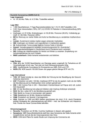 Stand 21.07.2021, 19:30 Uhr Ref. 312 (Abteilung 2) Kurzinfo Coronavirus (SARS-CoV-2) Lage insgesamt rd. 191,4 Mio. Fälle, rd. 4,11 Mio. Todesfälle weltweit. Lage DEU 2.203 Neuinfektionen, Reproduktionsfaktor 1,16; 7-Tage-Reproduktionsfaktor bei 1,19, 91.416 Todesfälle (+19). 3.631 freie Intensivbetten (16%), 361 (-8) COVID-19 Patienten in Intensivbehandlung (59% beatmet). Impfungen: rd. 87,1 Mio. Erstimpfungen: rd. 50,08 Mio. Personen (60,2%). Vollständig ge- impft: rd. 39,31 Mio. Personen (47,3%). Bundesregierung: Verlängerung der Quarantäneregeln für Rückkehrer bis 10. Septem- ber. BM Spahn: Warnung vor Corona-Inzidenz von mehr als 800 im Oktober. BY: Gesundheitsminister Holetschek fordert kath. Kirche zur Beteiligung an Impfkampagne auf. BE: Erstes Bundesland mit erneuter Inzidenz über 20. Leopoldina: Befürchtung wachsender Einkommensungleichheit durch Pandemie. DGIIN: Bedeutung der Inzidenz verschiebt sich. Daten zu Hospitalisierung und Intensivbe- handlung ebenfalls als wichtig zu erachten. Lage Europa AUT – CZE – HUN – SVN – SVK: Maßnahmen zur Pandemiebekämpfung sollen zwischen mitteleuropäischen Staaten stärker koordiniert werden. BEL: In Brüssel impfen nun auch Hausärzte gegen Covid-19, zusätzlich zu Impfzentren. FRA: 18.000 Neuinfektionen, Tageshöchstwert seit Mitte Mai; neuer Gesundheitspass (Nachweis über Impfung, Genesenenstatus oder negat. Test) eingeführt, verpflichtend bei Besuch von Kultureinrichtungen und Sehenswürdigkeiten. GBR: 96 Todesfälle innerhalb von 24 Stunden, Tageshöchstwert seit März; Impfkampagne stockt, in den letzten Tagen Zahl der Erstimpfungen so niedrig wie zuletzt im Dez. 2020. SVK: Bei anstehendem Papstbesuch sollen nur vollständig Geimpfte zur Teilnahme an öf- fentlichen Veranstaltungen zugelassen werden. Lage International CHN: Mehrere Flughafenmitarbeiter in Nanjing infiziert, hunderte Flüge gestrichen. Griechisch-orthodoxe Kirche: Synode ruft Gläubige zur Impfung auf. IND: US-Thinktank Center for Global Development schätzt Zahl der Corona-Todesfälle in IND bis zu zehnmal höher als gemeldet, Übersterblichkeit durch Coronapandemie in Höhe von 3,4 bis 4,7 Mio. Todesfällen befürchtet. IRN: 27.444 Neuinfektionen, neuer Tageshöchstwert; Impfquote soll bei erst 2 % liegen. ISR: Teilnahme an Veranstaltungen ab 100 Personen in geschl. Räumen nur noch für Ge- impfte, Getestete und Genesene; Maskenpflicht in Innenräumen wieder eingeführt. JPN: 1832 Neuinfektionen in Tokio, höchster Tageswert seit einem halben Jahr. KOR: 1784 Neuinfektionen, neuer Tageshöchstwert. SDA: Bis zu 60.000 Muslimen soll Pilgerfahrt nach Mekka ermöglicht werden, wenn in SDA wohnhaft und mindestens einmal geimpft. TUN: Premierminister Mechichi entlässt Gesundheitsminister, weiter hohe Fallzahlen. TWN: Buddhistische Organisation kauft 5 Mio. Dosen BNT für TWN. ZMB: Alle Staatsbediensteten zur Impfung aufgefordert, Import vom mehr Impfdosen aus CHN geplant. ...