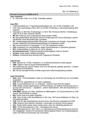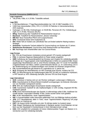Stand 23.07.2021, 15:00 Uhr Ref. 312 (Abteilung 2) Kurzinfo Coronavirus (SARS-CoV-2) Lage insgesamt rd. 192,54 Mio. Fälle, rd. 4,14 Mio. Todesfälle weltweit. Lage DEU 2.089 Neuinfektionen, 7-Tage-Reproduktionsfaktor bei 1,23, 91.492 Todesfälle (+34). 3.651 freie Intensivbetten (16%), 354 (-3) COVID-19 Patienten in Intensivbehandlung (56% beatmet). Impfungen: rd. 88,5 Mio. Erstimpfungen: rd. 50,41 Mio. Personen (60,6%). Vollständig ge- impft: rd. 40,37 Mio. Personen (48,5%). MV, NI: Forderung nach vorgezogenem Bund-Länder-Treffen. NI: Wirtschaftsminister Althusmann will durch Änderungen am Corona-Stufenplan rasches Inkrafttreten neuer Beschränkungen vermeiden. BY: Verwaltungsgerichtshof erlaubt Öffnung der Innenräume von Kneipen. Gesundheits- minister Holetschek hält Auffrischungsimpfungen für dringendes Thema. HH: Corona-Ausbruch in Ferienlager: 71 von 100 Teilnehmern infiziert. DAV: Ausstellung von Impfzertifikaten wegen Sicherheitslücken in Apotheken gestoppt. RKI: Inzidenzanstieg vor allem bei 15- bis 34-Jährigen. Bundesärztekammer: Präsident Reinhardt fordert tägliche Tests an Schulen. Drosten: Sorge wegen Impfgeschwindigkeit. Ethikrat: Vorsitzende Buyx besorgt über Fortgang der Pandemie. Lage Europa ESP: Spende von 7,5 Mio. Impfdosen v.a. an lateinamerikanische Länder geplant. GBR: Tägliche Tests für Supermarktmitarbeitende. ITA: Einführung des „grünen Passes“ ab 6.8. für 3G (geimpft, getestet, genesen) – Ausstel- lung bereits ab Erstimpfung. ISL: Mit J&J Geimpfte können ab Mitte August eine Auffrischungsimpfung erhalten. Lage International NGA: Mind. 13 Bundesstaaten haben am Donnerstag die Durchführung von Coronatests ausgesetzt. AUS: BT/P für Jugendliche ab 12 Jahren zugelassen. AZE: Coronamaßnahmen bis 1.9. verlängert – weiterhin keine Einreise möglich. CHN: Heftige verbale Gegenreaktion auf WHO-Drängen auf weitere Untersuchung des Ur- sprungs des Coronavirus – „respektlos“, „extrem überraschend“; 90% der Erwachsenen in Peking geimpft. CHN-MMR: Spende von 2 Mio. Impfdosen an MMR geplant, um Corona-Ausbruch an CHN Grenze unter Kontrolle zu bringen. ISR: Grüner Pass wird wieder eingeführt. JPN: Tokio mit fast 2.000 Neuinfektionen in 24h; insg. 106 Corona-Infektionen im Zshg. mit Olympiade gemeldet. TUR: Zahl der tägl. Neuinfektionen hat sich binnen zwei Wochen verdoppelt auf 9.586. TWN: Aufgrund stark fallender Fallzahlen Lockerungen ab nächster Woche geplant. CHL: Bürger dürfen wieder außer Landes reisen, wenn sie vollständig geimpft sind. MEX: 16.244 Neuinfektionen in 24h – Höchststand seit Januar. USA: Rettungsfonds iHv. USD 3 Mrd. zur Unterstützung und Wiederbelebung der Kommu- nen freigegeben; mehrere für kommenden Monat geplante Reisen von Kongressabgeord- neten nach ISR auf kommendes Jahr verschoben. ...
