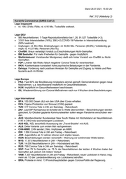 Stand 26.07.2021, 15:30 Uhr Ref. 312 (Abteilung 2) Kurzinfo Coronavirus (SARS-CoV-2) Lage insgesamt rd. 194,12 Mio. Fälle, rd. 4,16 Mio. Todesfälle weltweit. Lage DEU 985 Neuinfektionen; 7-Tage-Reproduktionsfaktor bei 1,26, 91.527 Todesfälle (+3). 3.551 freie Intensivbetten (16%), 356 (+2) COVID-19 Patienten in Intensivbehandlung (56% beatmet). Impfungen: rd. 89,4 Mio. Erstimpfungen: rd. 50,64 Mio. Personen (60,9%). Vollständig ge- impft: rd. 41,07 Mio. Personen (49,4%). ChefBK: Braun verteidigt Vorstoß zu Einschränkungen Nicht-Geimpfter. BM Seehofer: Für mehr Freiheiten für Geimpfte - gegen Impfpflicht. Weltärztebund: Vorsitzender Montgomery stellt sich hinter Vorstoß von ChefBK zu Nicht- Geimpften. FDP: Lindner hält Risiko falsch negativer Corona-Tests für verantwortbar. KKH: Krankenkasse konstatiert hohe psychische Belastungen in der Pandemie. Dehoga: Forderung nach positiven Anreizen für Geimpfte und Zugang zu Hotels und Res- taurants auch im Winter. Lage Europa FRA: Fast 60% der Bevölkerung mindestens einmal geimpft; Demonstrationen gegen neue Maßnahmen, u.a. beschlossene Impfpflicht im Gesundheitswesen. HUN: Impfpflicht im Gesundheitswesen beschlossen. ISL: Wiedereinführung von Corona-Maßnahmen nach nur 4 Wochen ohne Beschränkungen. Lage International BFA: 150.000 Dosen J&J von den USA über Covax erhalten. DZA: Eigene Produktion von Sinovac (CHN) geplant. TUN: 317 Corona-Tote in 24h am Samstag – Rekordwert. ZAF: Laut StP Ramaphosa ist Scheitel der 3. Welle überschritten – Beschränkungen werden gelockert; für Oktober geplante Kommunalwahlen sollen wegen Pandemie verschoben wer- den. AUS: Meistbevölkerter Bundesstaat New South Wales mit Höchststand an Neuinfektionen (145 in 24h) trotz wochenlangem Lockdown. AUS-NZL: NZL beschließt Aussetzung der „Travel-Bubble“ mit AUS. ALB: Delta-Variante zum ersten Mal nachgewiesen. CHN-MMR: CHN sendet 2 Mio. Impfdosen an MMR. IDN: 1.566 Corona-Tote in 24h am Freitag – Rekordwert. JOR: Jugendliche ab 12 Jahren können sich impfen lassen. KOR: Beschränkungen werden verschärft – Warnung vor schlimmster Welle bisher. MYS: 17.573 Neuinfektionen in 24h – Rekordwert. TUR: 14.000 Neuinfektionen in 24h – Höchststand seit Mai. RUS: 799 Corona-Tote in 24h am Samstag – Rekordwert. SGP: Fast 75 % Geimpfte; ca. 75 % der Neuinfektionen der letzten 4 Wochen traten bei Geimpften auf, jedoch mit mildem Verlauf. VNM: 7.307 Neuinfektionen in 24h am Freitag – Rekordwert; neuer Lockdown in Hanoi; insg. mehr als 1/3 der Landesbevölkerung von Lockdowns betroffen. BRA: Proteste in mind. 13 Provinzhauptstädten gegen Corona-Politik der Regierung. ...