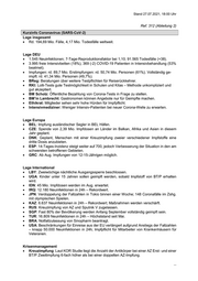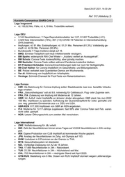 Stand 27.07.2021, 18:00 Uhr Ref. 312 (Abteilung 2) Kurzinfo Coronavirus (SARS-CoV-2) Lage insgesamt Rd. 194,69 Mio. Fälle, 4,17 Mio. Todesfälle weltweit. Lage DEU 1.545 Neuinfektionen; 7-Tage-Reproduktionsfaktor bei 1,10; 91.565 Todesfälle (+38). 3.995 freie Intensivbetten (18%), 369 (-2) COVID-19 Patienten in Intensivbehandlung (53% beatmet). Impfungen: rd. 89,7 Mio. Erstimpfungen: rd. 50,74 Mio. Personen (61%). Vollständig ge- impft: rd. 41,34 Mio. Personen (49,7%). BReg: Beratungen über weitere Testpflichten für Reiserückkehrer. RKI: Lolli-Tests gute Testmöglichkeit in Schulen und Kitas – Methode unkompliziert und gut akzeptiert. BM Scholz: Öffentliche Bezahlung von Corona-Tests in Frage zu stellen. BM’in Lambrecht: Gastronomen können Angebote nur für Geimpfte machen. Ethikrat: Mitglieder sehen sehr hohe Hürden für Impfpflicht. Intensivmediziner: Weniger Intensiv-Patienten bei neuer Corona-Welle zu erwarten. Lage Europa BEL: Impfung ausländischer Segler in BEL Häfen. CZE: Spende von 2,39 Mio. Impfdosen an Länder im Balkan, Afrika und Asien in diesem Jahr geplant. DNK: Geplant, Menschen mit einer Kreuzimpfung zweier verschiedener Impfstoffe eine dritte Dosis anzubieten. ESP: 14-Tages-Inzidenz steigt weiter auf 700, jedoch Verbesserung der Situation in den am schwersten betroffenen Gebieten. GRC: Ab Aug. Impfungen von 12-15-Jährigen möglich. Lage International LBY: Zweiwöchige nächtliche Ausgangssperre beschlossen. UGA: Kinder unter 15 Jahren sollen geimpft werden, sobald Impfstoff von BT/P erhalten wird. IDN: 45 Mio. Impfdosen werden im Aug. erwartet. IRQ: 12.180 Neuinfektionen in 24h – Rekordwert. JPN: Verdoppelung der Fallzahlen in Tokio binnen einer Woche; 148 Coronafälle im Zshg. mit olympischen Spielen. KAZ: 6.637 Neuinfektionen in 24h – Rekordwert; Maßnahmen werden verschärft. RUS: Kreuzimpfung von AZ und Sputnik V zugelassen. SGP: Fast 80% der Bevölkerung werden Anfang September vollständig geimpft sein. TUR: 16.809 Neuinfektionen in 24h – Höchststand seit Mai. BRA: Notfallzulassung von Sinopharm beantragt. USA: Beschränkungen für Einreise aus der EU verlängert aufgrund Anstiegs der Fallzahlen – knapp 50.000 Neuinfektionen in 24h; Impfpflicht für Mitarbeiter von Krankenhäusern für Veteranen. Krisenmanagement Kreuzimpfung: Laut KOR Studie liegt die Anzahl der Antikörper bei einer AZ Erst- und einer BT/P Zweitimpfung 6-fach höher als bei einer doppelten AZ-Impfung. ...