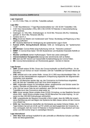 -2- Samstag 46.759 Neuinfektionen, erstmalig 10 Mill. Impfdosen an einem einzigen Tag ver- abreicht. IRN: Nur 8 % der Bevölkerung sind vollständig geimpft. Es kam zu einem Vorfall bei dem ein Impfstoff-Transporter überfallen und der Impfstoff gestohlen wurde. CUB: CUB will fortan den CHN Impfstoff Sinopharm verwenden. Bisher wurden nur 30 % anstelle der anvisierten 70 % der Bevölkerung geimpft. USA: Am Flughafen Washington Dulles Airport wurde ein großes Impf- und Testzentrum für ankommende Afghanen sowie US-Bürger und Inhaber von Greencards eingerichtet. Ein weiteres Zentrum ist für den Flughafen in Philadelphia in Planung. AUS: Rekordwert von 1.126 Neuinfektionen innerhalb von 24 h am Samstag. SGP: 80 % der Bevölkerung sind vollständig geimpft. VNM: 12.103 Neuinfektionen innerhalb von 24 h. 356 Todesfälle am Freitag. Krisenmanagement USA: US-Geheimdienste können Corona-Ursprung in Bericht nicht klären. sowohl eine Übertragung von Tier zu Mensch als auch ein Laborunfall in China als „plausible Hypothesen WHO: befürchtet 236.000 neue Corona-Todesfälle in Europa bis 1. Dezember Termine 31.08.: KriSta 02.09.: TSK Risikogebiete 02.09.: StA Impfstoffproduktion 02.09.: AG Impfstoffabgabe