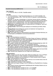 Stand 06.09.2021, 15:00 Uhr Ref. 312 (Abteilung 2) Kurzinfo Coronavirus (SARS-CoV-2) Lage insgesamt rd. 220,64 Mio. Fälle, rd. 4,57 Mio. Todesfälle weltweit Lage DEU 4.749 Neuinfektionen; 7-Tage-Reproduktionsfaktor bei 1,01; 92.354 Todesfälle (+8) 3.626 freie Intensivbetten (19%), 1.323 (+42) COVID-19 Patienten in Intensivbehandlung (50% beatmet) Impfungen: rd. 102,8 Mio.; Erstimpfungen: rd. 54,72 Mio. Personen (65,8%); vollständig geimpft: rd. 50,99 Mio. Personen (61,3%); Impfquote in HB am höchsten (75,9%), in SN am niedrigsten (55,5%); wahrscheinliche Impfdurchbrüche: 24.098 (aus wöchentlichem RKI-Bericht bis KW 34) Inzidenz bei 84,3; hospitalisierte Fälle 1.361 (-161); Inzidenz hospitalisierte Fälle 1,64 BM Spahn: Erhöhung der Impfquote um fünf Millionen Freiwillige Auskunftsrecht von Arbeitgebern bei der Impfstatus-Abfrage ihrer Beschäftigten ist weiter umstritten. BReg: Bereitstellung von hundert Millionen Impfdosen für die internationale Impfkampagne bis Jahresende BReg: mehr Flexibilität für Länder, um regional besser auf die Corona-Lage reagieren zu können BW: erwägt als erstes Bundesland einen Teil-Lockdown für Ungeimpfte. DGKJ: sieht Impfungen bei Kindern unter zwölf Jahren, für die es bisher keine Zulassung und keine Empfehlung durch die Ständige Impfkommission gibt, sehr kritisch. HDE: Konsumbarometer: Infektionsgeschehen dämpft Verbraucherstimmung. YouGov: 58 Prozent für strengere Regeln für Ungeimpfte, 28 Prozent gleiche Regeln wie für Geimpfte und Genesene richtig, 9 Prozent der Befragten gaben an, alle Maßnahmen zur Bekämpfung der Corona-Pandemie abzulehnen. div. Akteure: für einheitliche Quarantäneregeln in Schulen Ostbeauftragter Wanderwitz: rechnet mit steigenden Inzidenzen im Osten (geringere Impfquote, hohe Anzahl Personen, die Maßnahmen ablehnen) Lage Europa FRA: 10.410 Neuinfektionen innerhalb von 24 h, friedliche Demonstrationen gegen Corona-Maßnahmen. Hohe Fallzahlen und Corona-Sterblichkeit in Französisch- Polynesien, seit dem 28. August gilt dort ein Lockdown. GBR: Überraschend keine Empfehlung der Impfkommission für flächendeckende Corona- Impfungen für 12- bis 15-Jährige NDL: Verschärfung der Einreiseregelungen. Friedliche Großdemonstrationen gegen Corona-Politik in Amsterdam. BGR: verzeichnet höchste Rate an COVID-Sterbefällen in Europa. SVK: keine Impfpflicht für Besucher der Gottesdienste bei Papstbesuch vom 12. bis zum 15. September. Lage International TUR: Seit Januar wurden 96,8 Mio. Impfdosen verimpft. 38,15 Mio. Menschen vollständig geimpft ISR: Ab dem 19. September wird Touristen die Einreise gewährt. Lockdown während jüdi- scher Feiertage dank Boosterimpfung vermieden BHR: Drittimpfung für Menschen die zuvor eine Impfung mit dem Impfstoff Sputnik V erhal- ten haben. ZAF: 16 % der erwachsenen Bevölkerung vollständig geimpft CMR: Große Teile der Bevölkerung zweifeln an der Existenz des Corona-Virus. ...