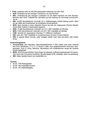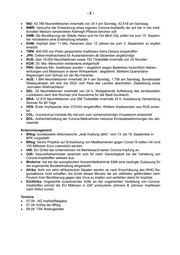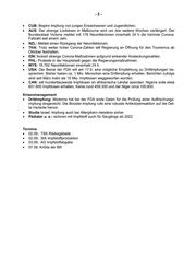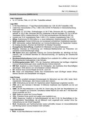 -2- Samstag 46.759 Neuinfektionen, erstmalig 10 Mill. Impfdosen an einem einzigen Tag ver- abreicht. IRN: Nur 8 % der Bevölkerung sind vollständig geimpft. Es kam zu einem Vorfall bei dem ein Impfstoff-Transporter überfallen und der Impfstoff gestohlen wurde. CUB: CUB will fortan den CHN Impfstoff Sinopharm verwenden. Bisher wurden nur 30 % anstelle der anvisierten 70 % der Bevölkerung geimpft. USA: Am Flughafen Washington Dulles Airport wurde ein großes Impf- und Testzentrum für ankommende Afghanen sowie US-Bürger und Inhaber von Greencards eingerichtet. Ein weiteres Zentrum ist für den Flughafen in Philadelphia in Planung. AUS: Rekordwert von 1.126 Neuinfektionen innerhalb von 24 h am Samstag. SGP: 80 % der Bevölkerung sind vollständig geimpft. VNM: 12.103 Neuinfektionen innerhalb von 24 h. 356 Todesfälle am Freitag. Krisenmanagement USA: US-Geheimdienste können Corona-Ursprung in Bericht nicht klären. sowohl eine Übertragung von Tier zu Mensch als auch ein Laborunfall in China als „plausible Hypothesen WHO: befürchtet 236.000 neue Corona-Todesfälle in Europa bis 1. Dezember Termine 31.08.: KriSta 02.09.: TSK Risikogebiete 02.09.: StA Impfstoffproduktion 02.09.: AG Impfstoffabgabe