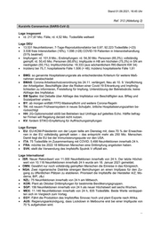 Stand 02.09.2021, 15:00 Uhr Ref. 312 (Abteilung 2) Kurzinfo Coronavirus (SARS-CoV-2) Lage insgesamt rd. 218,38 Mio. Fälle, rd. 4,54 Mio. Todesfälle weltweit Lage DEU 13.715 Neuinfektionen; 7-Tage-Reproduktionsfaktor bei 1,01; 92.256 Todesfälle (+33) 3.421 freie Intensivbetten (15%), 1.169 (+34) COVID-19 Patienten in Intensivbehandlung (51% beatmet) Impfungen: rd. 102,2 Mio.; Erstimpfungen: rd. 54,42 Mio. Personen (65,5%); vollständig geimpft: rd. 50,60 Mio. Personen (60,9%); Impfquote in HB am höchsten (75,4%) in SN am niedrigsten (55,2%); Impfdurchbrüche: 18.333 (aus wöchentlichem RKI-Bericht KW 34) Inzidenz bei 76,9; hospitalisierte Fälle 1.443 (- 63); Inzidenz hospitalisierte Fälle 1,74 BM Karliczek: weiter für Maskenpflicht um Präsenzunterricht zu ermöglichen, spricht sich für Freitesten bei Quarantäne aus Virologe Drosten: mahnt Erhöhung der Impfquote und Vorbereitung auf Herbst, Winter an. Virologe Streeck: lehnt 2G-Regel als unsozial und medizinisch nicht begrünbar ab. Weiter Diskussion um Booster-Impfungen MP Hans (SL): favorisiert 3G-Regel NRW: Grüne stellen Antrag auf „flächendeckend auszurollendes Abwasser-Monitoring“ als Frühwarnsystem und Maßstab für Corona-Schutzmaßnahmen Lage Europa BEL: 2.025 Neuinfektionen innerhalb 24 h. ITA: erstreckt die obligatorische Nutzung des Green Passes auf Zugang zu Verkehrsmit- teln wie Zügen, Flugzeugen und Fähren. Nicht-Geimpfte Reisende aus den USA müssen sich nach Einreise für fünf Tage in Quarantäne begeben. ESP: 70 % der Bevölkerung ist vollständig geimpft. PRT: gewährt Touristen aus Brasilien nach 18 Monate Einreiseverweigerung wieder die Einreise. Einreisebeschränkungen für Briten und Brasilianer gelockert. GBR: bietet Personen ab 12 Jahren mit geschwächtem Immunsystem Drittimpfung an. Dies betrifft ca. 400.000 bis 500.000 Personen. Prinz Harry hat die mangelnde Versorgung von Entwicklungsländern mit Corona-Impfstoffen kritisiert. SVK: Mehrere Tausend Menschen haben in den größten Städten gegen die Corona-Politik der Regierung demonstriert, es kam zu Festnahmen und Verletzen. DNK: verzichtet fortan weitgehend auf die Vorlage eines Impfnachweises. Lage International MAR: ermöglicht als eines der erste Länder Afrikas die Impfung der 12 bis 17-jährigen. Bislang wurden bereits ca. 33 Mio. Impfdosen an erwachsene Personen verimpft. IND: Seit über 18 Monaten wird der Schulbesuch in Präsenz teilweise wieder ermöglicht. KOR: 2.000 Neuinfektionen innerhalb 24 h. PRK: lehnt die Lieferung von 3 Mio. Impfdosen Sinovac ab und verweist darauf, dass die- se an stärker getroffene Länder gehen sollen. CHN: verabreichte am Dienstag 11.6 Mio. Impfdosen. TWN: konnte nach langen Umwegen Covid-19 Impfstoffe von Pfizer/BioNTech in Empfang nehmen. JPN: erneuter Fall einer kontaminierten Impfstoffampulle des Herstellers Moderna als vier- ter Fall innerhalb einer Woche MEX: 17.337 Neuinfektionen innerhalb von 24 h, 1.117 Todesfälle. BRA: 27.345 Neuinfektionen innerhalb von 24 h, 737 Todesfälle. ...