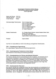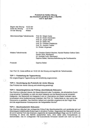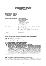 Protokoll der sechsten Sitzung des Gremiums gemäß $ 34 Abs. 8 BerIHG vom 16, April 2021 Beginn der Sitzung: 9.00 Uhr Ende der Sitzung: 10.10 Uhr Ort der Sitzung: Webex Stimmberechtigte Teilnehmende: Prof. Dr. Sergio Costa Prof. Dr. Kirstin Drenkhahn Prof. Dr. Jürgen Neyer Prof. Dr. Dieter Ohr Prof, Dr. Christian Pestalozza Prof. Dr. Joachim Trebbe Dr. Kirsten Jörgensen Weitere Teilnehmende: Dr. Christian-Dietrich Bracher, Kanzlei Redeker Sellner Dahs Kerstin Dück, Rechtsamt Dr. Andreas Huhn, Rechtsamt Daphne Stelter, Nachwuchsförderung des Fachbereichs Protokoll: Daphne Stelter Herr Prof. Dr. Costa eröffnet um 9.00 Uhr die Sitzung und begrüßt die Teilnehmenden. TOP 1-- Feststellung der Tagesordnung Die vorgeschlagene Tagesordnung wird einstimmig angenommen. TOP 2 - Genehmigung des Protokolls der fünften Sitzung Das Protokoll der fünften Sitzung wird einstimmig genehmigt. TOP 3 - Beschlussfassung über den Schlussbericht und die Anlagen Das Gremium diskutiert den Entwurf für seinen abschließenden Bericht. Nach Vornahme von Korrekturen und Änderungen wird der aktualisierte Schlussbericht zur Abstimmung gestellt und einstimmig beschlossen. Es besteht Einmütigkeit darüber, die Anlagen | und Il einer abschließenden Justierung hinsichtlich der Darstellung der Quellenangaben in der Tabelle (Anlage !) und der Quellenbenennungen im Quellenverzeichnis (Anlage Il) zuzuführen und über ihre Endfassungen im Umlaufverfahren abzu- stimmen. TOP 4 - Weitere Verfahrensschritte Die Überarbeitungen werden bis Mittwoch, den 21. April 2021 vorgenommen und die aktualisierten Dateien den Mitgliedern des Gremiums zur Verfügung gestellt. Die anschließende Abstimmung im Umlaufverfahren erfolgt bis Freitag, den 23. April 2021. Herr Prof. Dr. Costa schließt die Sitzung um 10.10 Uhr