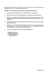 rationspartner genannt. Mit der Umsetzung und Durchführung von im Katalog genannten Maßnahmen soll noch im Jahr 2008 begonnen werden Zielfelder des kurzfristig umsetzbaren Maßnahmenkatalogs sind daher: 1. Förderung der Alkoholabstinenz bis zur Vollendung des 16. Lebensjahres 2. Maßvoller Alkoholkonsum bei jungen Menschen, Minimierung des Rauschtrinkens 3. Motivation und Gewinnung der Bevölkerung für den risikoarmen Alkoholkonsum - Ent wicklung und Stabilisierung eines Problembewusstseins hinsichtlich des eigenen Alko holkonsums 4. Erhöhung der ärztlichen (Kurz)lnterventionen bei Patienten mit riskantem oder abhän gigem Alkoholkonsum 5. Maßnahmen zum breitenwirksamen Verzicht auf Alkohol in der Schwangerschaft und beim Stillen, bei der Arbeit, im Straßenverkehr, beim Sport und während der Einnahme von Medikamenten, zur Vermeidung von Mischkonsum 6. Senkung des Alkoholkonsums durch gesetzliche Maßnahmen. Bayerischer Brauerbunc! e.V. Postfach 34 01 62, 80098 München Oster-von-Miller-Ring 1,80333 München Telefon 0 89 / 28 66 04 - 0 Telefax 0 89/28 66 04 99 Seite 36 von 36