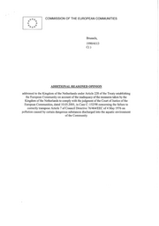 REASONED OPINION addressed to the Kingdom of the Netherlands under Article 228 of the Treaty establishing the European Community on account of the failure to take measures to implement the judgement of the Court of Justice of the European Communities, dated 10.05.2001, in Case C-152/98 concerning the failure to correctly transpose Article 7 of Council Directive 76/464/EEC of 4 May 1976 on pollution caused by certain dangerous substances discharged into the aquatic environment of the Community 1. The judgement by the Court of Justice of the European Communities of 10.05.2001 in Case C-152/98 concerning Commission/Kingdom of the Netherlands states that: "by failing to adopt for the Scheldt basin all the measures necessary to transpose Article 7 of Council Directive 76/464/EEC of 4 May 1976 on pollution caused by certain dangerous substances discharged into the aquatic environment of the Community, the Kingdom of the Netherlands has failed to fulfil its obligations under that directive". 2 Under Article 228 of the Treaty establishing the European Community, if the Court of Justice finds that a Member State has failed to fulfil an obligation under the Treaty, the State is required to take the necessary measures to comply with the judgement of the Court of Justice. In its Order of 28 March 1980 (Joined Cases 24 and 97/80 R, Commission v France [1980] ECR 1319, at paragraph 16 of the operative part), the Court stated that: "As the Court held in its judgement of 13 July 1972 in Case 48/71, Commission of the European Communities v Italian Republic [1972] ECR 527, the finding in a judgement having the force of res judicata that the Member State concerned has failed to fulfil its obligations under Community law amounts to "a prohibition having the full force of law on the competent national authorities against applying a national rule recognized as incompatible with the Treaty and, if the circumstances so require, an obligation on them to take all appropriate measures to enable Community law to be fully applied”. It follows that by reason solely of the judgment declaring the Member State to be in default, the State concerned is required to take the necessary measures to remedy its default and may not create any impediment whatsoever." In its judgement of 6November 1985 (Case 131/84 Commission v Italy [1985] ECR 3531, at paragraph 7 of the operative part), the Court also held that "Article 171 of the EEC Treaty (now Article 228 EC) does not lay down a time- limit within which a judgment must be complied with. However, it is well established that the implementation of a judgment must be commenced immediately and must be completed as soon as possible." This case law has recently been confirmed by the Court of Justice in its Jjudgement of 4 July 2000 (C-387/97, Rep. I-05047, paragraph 82).