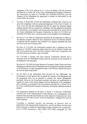 judgement of the Court referred to at 1, and in accordance with the procedure provided for in Article 228 of the Treaty establishing the European Community, the Commission, by letter of 27.06.2002 (ref. SG(2002) D/220193), gave the Kingdom of the Netherlands the opportunity to submit its observations on the matter within two months. By letter of 26.08.2002 (13796) the Netherlands confirmed that it had not yet given full compliance with the mentioned judgement of the Court of Justice. In view of the fact that the Netherlands had still not taken the necessary legally binding measures that are required for compliance with the judgement concerned, the Commission, in accordance with the procedure provided for in Article 228 of the Treaty establishing the European Community, by letter of 19.12.2002 (ref. SG(2002) D/221050), sent a reasoned opinion to the Kingdom of the Netherlands. By letter of 15.01.2003 the Netherlands described the developments in relation to the adoption of quality objectives and a programme for the river Western Scheldt. It indicated that the measures were foreseen to be adopted, published and enter into force by the end of January 2003. By letter of 11.02.2003, the Netherlands mentions that a regulation has been adopted on 3.02.2003 containing quality objectives for the Western Scheldt and that it has entered into force. The letter mentions further that a programme has also been drawn up of which a copy is included. On 17.02.2003 a meeting took place between Commission officials and a delegation from the Netherlands during which the measures for the execution of the judgement were discussed. By email of 21.05.2003 the Dutch Ministry of Transport, Public Works and Water Management indicated that the Regulation and the programme had been presented to the Parliament, to water management bodies in the Western Scheldt area and to the relevant supervising bodies. On the basis of the information thus provided by the Netherlands, the Commission is of the opinion that as regards the contents of the Regulation and the programme there are no grounds to continue the current infringement procedure. However, the Commission considers that there are insufficiencies as regards the issues of the formal adoption and the publication of the programme and is therefore, in accordance with the procedure provided for in Article 228 of the Treaty establishing the European Community, sending this additional reasoned opinion. The programmes adopted on the basis of Article 7 of Directive 76/464/EEC constitute part of the implementation of this Directive. As a consequence, such measures must meet the requirements set in this respect by Community law. In its Judgement of 27.02.2003 in case C-415/01 (Commission v. Belgium) the Court of Justice held that: “according to consistent case-law, the provisions of directives must be implemented with unquestionable binding force, and the specificity, precision and clarity necessary to satisfy the requirements of legal certainty (see, in particular, Case C-159/99 Commission v Italy [2001] ECR I-4007, paragraph 32). The 3