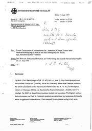 10/66/97 IL 13:41 BMI BONN 1B5/1ES + +43 223 562352 449 228 S15 2694 NR.543 interessenlage F: EMC möchte erreichen, daß die Ministererlaubnis nur unter der Auflageerteilt wird, daß PCS nicht auch die Beteiligung der K + S AG an Potacan erwirbt. Andernfalls werde die Wettbewerbsfähigkeit von EMC,die auch den deutschen Markt mit Kali beliefert, erheblich beeinträchtigt. Das Bundeskartellamtteilt diese Bedenken und hat seine Untersagungsverfügung - neben weiteren Gründen - auch darauf gestützt. Die (alte) französische Regierung hat sich sowohl während des Verfahrens vor dem Bundeskartell- amt als auch im Ministererlaubnisverfahren für die Interessen von EMCeingesetzt. K+S/PCS: - - Genehmigung der Fusion Anteil an Potacan selber zu behalten (Vorteile für weltweiten Vertrieb) D: Keine Festlegung bezüglich der Erfolgsaussichten, keine Bewertung der französischen Interessen, da der Anschein der Befangenheit im laufenden Verfahren unbedingt zu vermeiden ist, Baron 7610SCYK. DOT 10.05.97 TB6 D85