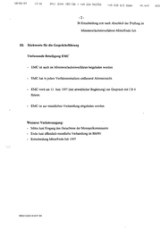 ‚arBeeat 13:42 EMUI BONN IBS/IBS > +49 228 562352 us 228 615 264 NR.S3 -2- D: Entscheidung erst nach Abschluß der Prüfung im Ministererlaubnisverfahren Mitte/Ende Juli. UL Stichworte für die Gesprächsführung Umfassende Beteiligung EMC - EMCist auch im Ministererlaubnisverfahren beigeladen worden. - EMC hat in jedem Verfahrensstadium umfassend Akteneinsicht. - EMC wird am 13. Juni 1997 (mit anwaltlicher Begleitung) ein Gespräch mitIB 6 führen. - EMCist zur mündlichen Verhandlung eingeladen worden. Weiterer Verfahrensgang: - Mitte Juni Eingang des Gutachtens der Monopolkommission - Ende Juni öffentlich-mündliche Verhandlung im BMWi - Entscheidung Mitte/Ende Juli 1997 ISO9ISCIZDOC 09.06.97 IBS 05