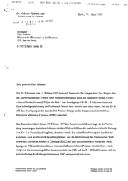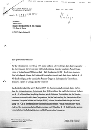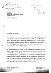 DIL vu 19/08/7977 . un 15:45 me BMWI BONN IES/IES > +45 225 55 3352 ne ng Dr. Günter Rexrodt Mas +49 ZE3 615 25824 Ni. 545 Bonn, 31. März 1997 Bundesminister für Wirtschaft - 8 8 1 : . Gesch.-2 (n:i.E. 2 1 2 1 / / 0 0 4 8 0 2 2 Monsieur Jean Arthuis Ministre de l’Economie et des Finances 139, Rue de Bercy F-75572 Paris Cedex 12 Sehr geehrter Herr Minister! Für Ihr Schreiben vom 11. Februar 1997 dankeich Ihnen sehr. Sie bringen darin Ihre Sorgen über die Auswirkungendes Erwerbs einer Mehrheitsbeteiligung durch die kanadische Potash Corpo- ration of Saskatchewan (PCS) an der Kal + Salz Beteiligungs AG (K + S AG) zum Ausdruck. Eine befriedigende Lösung der Problematik könnte Ihrer Ansicht nach darin liegen, daß dieK +S AG ihre Beteiligung an der kanadischen Potacan-Gruppean das französische Unternehmen Entreprise Miniere et Chimique (EMC) veräußert. Das Bundeskartellamt hat am 27. Februar 1997 den Zusammenschluß untersagt, da die Verbin- dung des einzigen deutschen Anbieters mit dem Weltmarktführer die marktbeherrschende Stellung vonK + S in Deutschland langfristig absichern würde. Bei seiner Entscheidung hat das Bundes- kartellamt auch ausdrücklich darauf hingewiesen, daß die Marktstellung des französischen Wett- bewerbers Entreprise Miniere et Chimique (EMC) auf dem deutschen Markt infolge der Betei- ligung von PCS an dem kanadischen Gemeinschaftsunternehmen Potacan verschlechtert würde. Aufgrund des zusammengefaßten Marktpotentials von PCS und der K + S GmbH würdensich die wirtschaftlichen Einflußmöglichkeiten von EMC entsprechend reduzieren, Villemombler Straße 76, 53123 Bonn Telefon: (0228) 615-23 56 Postanschrift: 53107 Bonn Tefefak: (0228) 615-44 32 oo