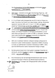-2- Das Bundeskartellamt teilt die EMC-Bedenken und hat seine Untersa- gungsverfügung z. T. darauf gestützt. 4) EMC fordert - unterstützt von der (alten) französischen Regierung -, daß Vtt er In eine evtl. Ministererlaubnis nur unter der Auflage erteilt wird, daß K + S sei- g re z ng nen 80,%-Anteil an Potacan an EMC veräußert. >) K + S und Potash wollen demgegenüber den 50 % Anteil an Potacan be- halten. Sie können ihre Position auch darauf stützen, daß das „Shareholder Agreement‘ zwischen EMC und K + S vom 11.12.1995, das Ergebnis zweijährigerVerhandlungenvon EU-Kom. mitEMCund K+S ist, “a und eine© jeweilseigenesYermiarktupermöglicht. Es E istK+S auch nicht möglich, die Potacan-Produktion im Alleingang zurückzufahren, um auf diese Weise das Agreement zu Lasten von EMC zu unterlaufen. Überdies haben beide Gesellschafter unaus voneinanderdie Möglichkeit, Potacan in eine Produkti 6) andeln. EMC wird im laufenden Verfahren umfassend beteiligt (umfassende Ak- teneinsicht in jedem Verfahrensstadium; Gespräche im BMWi; Einladung zur Ende Juni stattfindenden mündlichen Verhandlung im BMWi ). Siehe auch Brief BM Rexrodt an seinen französischen Kollegen (Anlage). 7) Die Monopolkommission hat in ihrem gestern vorgelegten Gutachten ein- stimmig die „deutliche Empfehlung“ gegeben, die Ministererlaubnis nicht zu muiunbe erteilen - auch nicht unter Auflagen. 8) Eine Entscheidung über die beantragte Ministererlaubnis steht nach Ab- schluß der Prüfungen im Rahmen des Ministererlaubnisverfahrens > Mitte/Ende Juli an. Aussagen über Erfolgsaussichten sollten vermieden | werden. Dr. Lochte