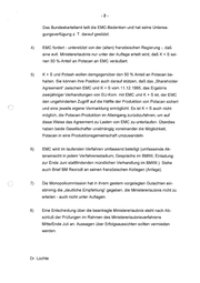 -2- Das Bundeskartellamt teilt die EMC-Bedenken und hat seine Untersa- gungsverfügung z. T. darauf gestützt. 4) EMC fordert - unterstützt von der (alten) französischen Regierung -, daß eine evtl. Ministererlaubnis nur unter der Auflage erteilt wird, daß K + S sei- nen 50 %-Anteil an Potacan an EMC veräußert. >) K + S und Potash wollen demgegenüber den 50 % Anteil an Potacan be- halten. Sie können ihre Position auch darauf stützen, daß das „Shareholder Agreement‘ zwischen EMC und K + S vom 11.12.1995, das Ergebnis zweijähriger Verhandlungen von EU-Kom. mit EMC und K+S ist, der EMC den ungehinderten Zugriff auf die Hälfte der Produktion von Potacan sichert und eine jeweils eigene Vermarktung ermöglicht. Es ist K+ S auch nicht möglich, die Potacan-Produktion im Alleingang zurückzufahren, um auf diese Weise das Agreement zu Lasten von EMC zu unterlaufen. Überdies haben beide Gesellschafter unabhängig voneinander die Möglichkeit, Potacan in eine Produktionsgemeinschaft umzuwandeln. 6) EMC wird im laufenden Verfahren umfassend beteiligt (umfassende Ak- teneinsicht in jedem Verfahrensstadium; Gespräche im BMWi; Einladung zur Ende Juni stattfindenden mündlichen Verhandlung im BMWi ). Siehe auch Brief BM Rexrodt an seinen französischen Kollegen (Anlage). 7) Die Monopolkommission hat in ihrem gestern vorgelegten Gutachten ein- stimmig die „deutliche Empfehlung“ gegeben, die Ministererlaubnis nicht zu erteilen - auch nicht unter Auflagen. 8) Eine Entscheidung über die beantragte Ministererlaubnis steht nach Ab- schluß der Prüfungen im Rahmen desMinistererlaubnisverfahrens Mitte/Ende Juli an. Aussagen über Erfolgsaussichten sollten vermieden werden. Dr. Lochte
